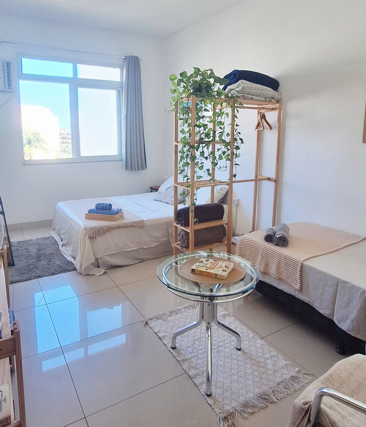 Espaço inteiro. O apartamento é amplo, aconchegante, organizado, bem arejado e iluminado, com sol da manhã. No quarto, há uma cama queen (euro colchão super premium) e um closet espaçoso. A sala é grande, com mesa de jantar, sofá-cama (casal) e uma varanda com plantas e rede. A cozinha é completa, equipada com todos os utensílios necessários. O banheiro foi reformado e possui chuveiro 220v. O ambiente conta com ar-condicionado, ventilador de teto e ventilador portátil de chão.