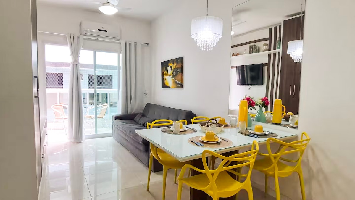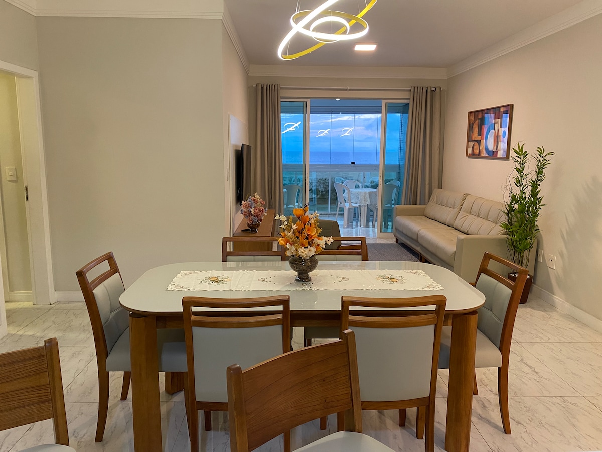 Apartamento tem decoração alegre, iluminado e arejado. As varandas não possuem telas de proteção. As acomodações são para até 4 adultos e um bebê. Fica a 400 metros da praia. Todo montado para dar conforto e praticidade aos hóspedes. Edifício com câmaras nas áreas comuns ( garagens, entrada, corredores, escadas, Hall dos andares e elevador). 50% dos apartamentos tem moradores fixos. Prédio muito bem decorado, ideal para famílias e/ou pessoas que buscam conforto e tranquilidade.