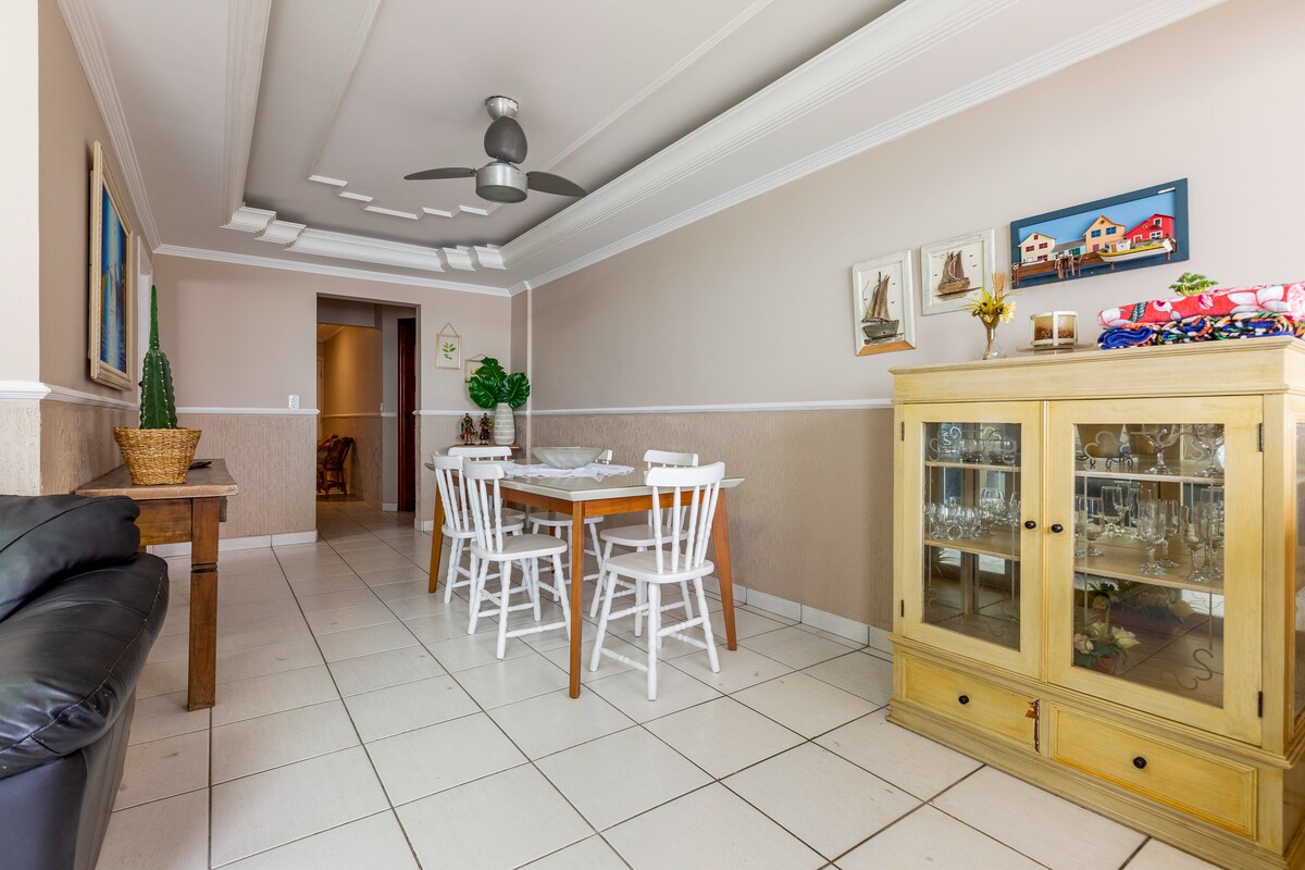 Oitavo andar, 2 elevadores Ventiladores em todos os cômodos,ar condicionado na sala,churrasqueira na varanda.Vista pro mar,1 quadra e meia da praia.... restaurantes.... barzinhos .... mercado, padaria ,farmácia,pet,da pra fazer tudo a pé.....Garagem 1, Móveis e utensílios,tudo que for necessário na cozinha.....,limpeza prioridade.....tudo entregue higienizado....cheiroso.... wi-fi....tv smart. Tv em um dos quartos. Toda energia da casa e 110wats