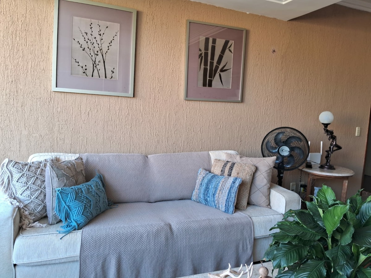 O apartamento está localizado em frente a praia, em um condomínio muito bonito, com jardins, piscinas e espelhos d'água. A área de lazer tem jacuzzi, piscinas, academia, salão de jogos, brinquedoteca, sauna e playground. É muito bom chegar da praia e cair nas piscinas. Localizado no último andar, propicia uma visão privilegiada da praia e do mar. É reconfortante relaxar na rede da varanda e observar a paisagem. No quarto tem escrivaninha, que permite trabalhar, já que a internet é rápida.