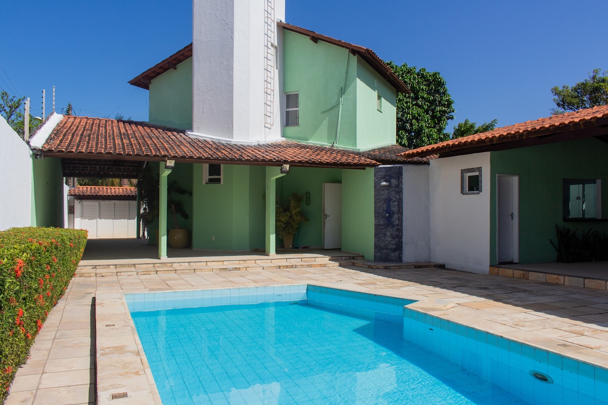 Ficamos do lado do Golf Ville, apenas 4 minutos da praia e a 1 km do Beach Park. A casa conta com piscina com Wi-fi Led com mais de 80 cores, jacuzzi, área de churrasco, 3 suítes sendo 2 com ar condicionado, 2 quartos triplos com cama de casal e solteiro ambos com ar condicionado, 5,5 banheiros todos com chuveiro elétrico, 3 quartos duplos com camas de solteiro. A casa tem bastante espaço para redes, contendo uma ampla e ventilada varanda.
