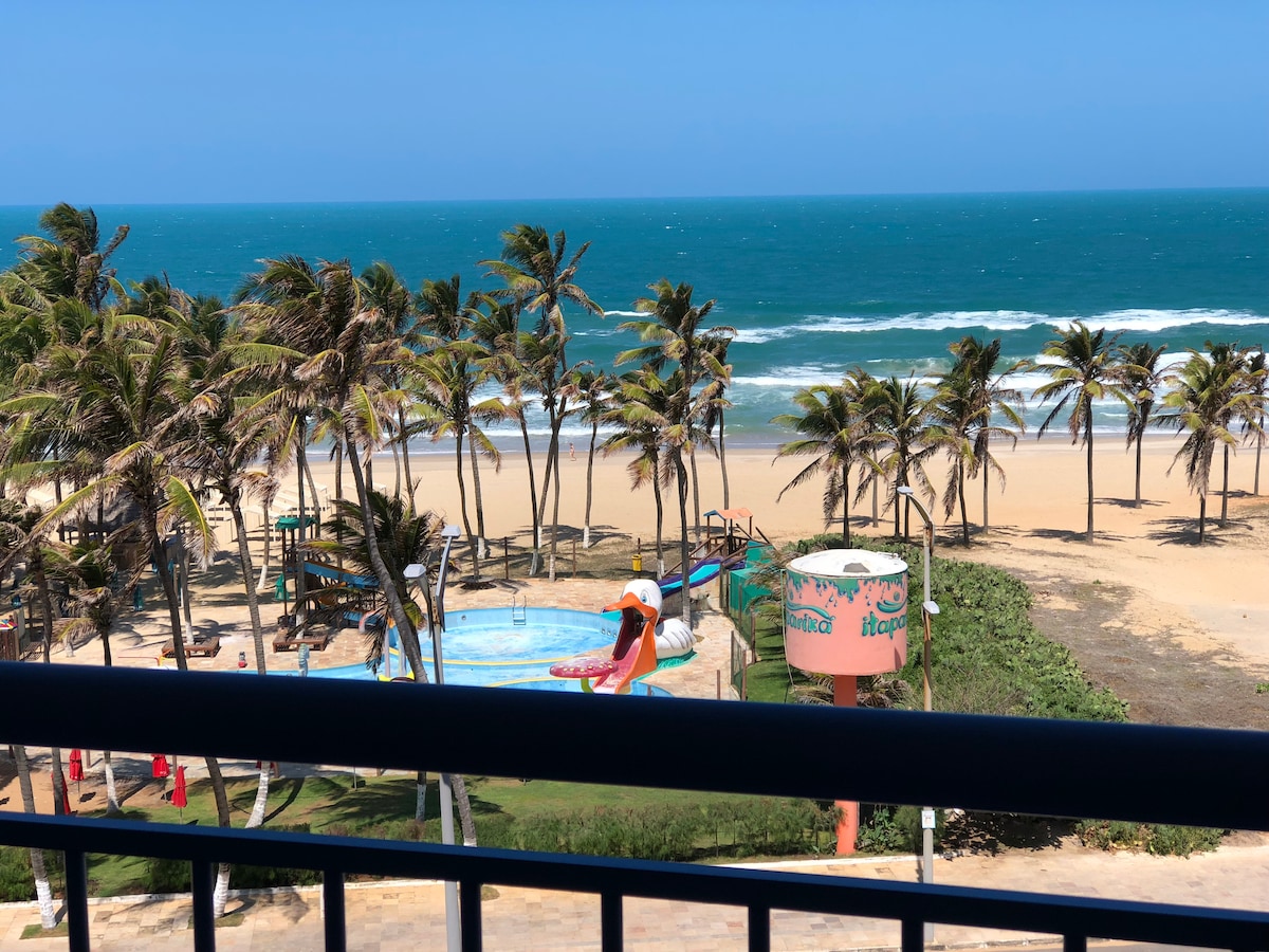 O apartamento está localizado em frente a praia, em um condomínio muito bonito, com jardins, piscinas e espelhos d'água. A área de lazer tem jacuzzi, piscinas, academia, salão de jogos, brinquedoteca, sauna e playground. É muito bom chegar da praia e cair nas piscinas. Localizado no último andar, propicia uma visão privilegiada da praia e do mar. É reconfortante relaxar na rede da varanda e observar a paisagem. No quarto tem escrivaninha, que permite trabalhar, já que a internet é rápida.
