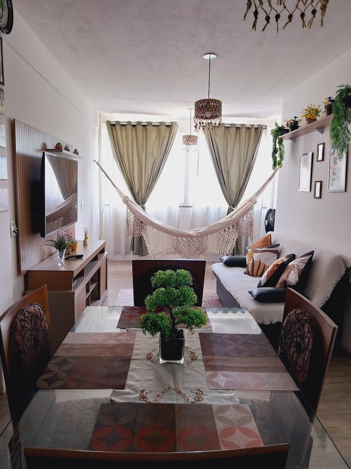 Hospede-se com qualidade e conforto a preços econômicos a poucos metros da praia. sala, cozinha americana: com fogão, coifa, microondas, cafeteira, sanduicheira, liquidificador, geladeira, TV, WiFi. Lençóis, travesseiros e 02 ventiladores, 01 cama de casal e 02 colchões de solteiro, 02 televisores , 01 na sala e outra no quarto. OBS:NÃO OFERECEMOS TOALHAS. NÃO ACEITAMOS PETS NO APTO.