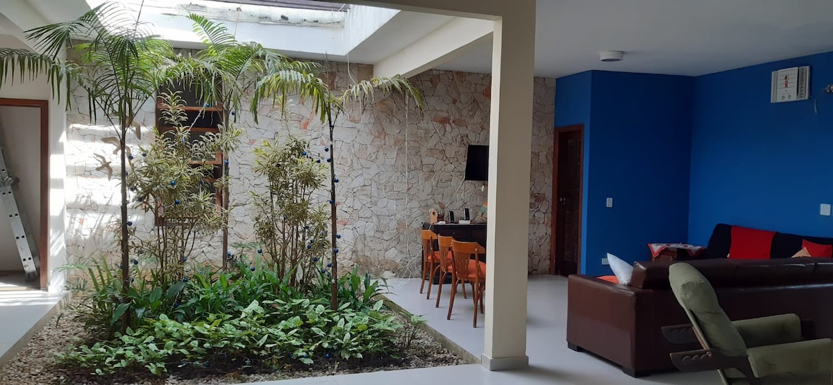 Casa aconchegante com vista para montanha na Praia do Guaiúba que é uma área de reserva ambiental. 3 minutos a pé da praia. São 3 quartos, sendo uma suíte e mais dois banheiros, com uma sala de estar/jantar e mais uma sala de televisão. Ao lado da piscina, há uma área coberta para CHURRASCOS. . Temos mais um terraço coberto. O Guaiúba é uma pequena praia de ruas de TERRA, ideal para famílias que gostam de natureza e desejam descansar,. Estacionamento COBERTO E FECHADO PARA 3 CARROS.