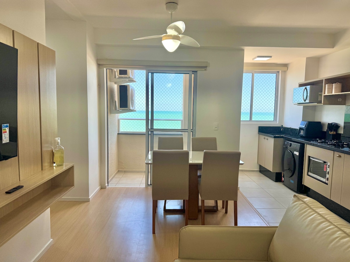 Apartamento com vista para o mar de todos os cômodos, e com uma bela vista para um morro. Localizado com frente para a praia e de costas ao morro. Mar calmo, ideal para a prática de caiaque, stand up e diversão das crianças! Água cristalina na grande maioria dos dias. Bares, restaurantes e banana boat ao redor! Todos os quartos possuem ar condicionado. Wi-fi 100 megas Tv smart. OBSERVAÇÃO: A taxa de limpeza é para o hóspede receber o apartamento limpo! O 5º hóspede dormirá num colchão extra
