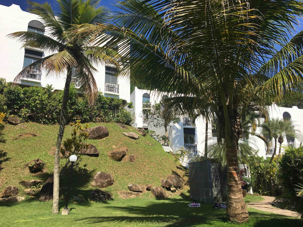 Relaxe após uma semana exaustiva neste espaço tranquilo e cheio de estilo. Por um fim de semana ou uma temporada mais longa - aqui você recarrega suas energias com vista direta para o mar. E piscina, academia se quiser mais movimento. A poucos passos das melhores Marinas do Saco da Ribeira e de praias maravilhosas. Um apartamento com todo o conforto para até 4 pessoas. O Apartamento é um Studio conceito aberto com muito charme e requinte, onde você e sua família poderão curtir momentos únicos.