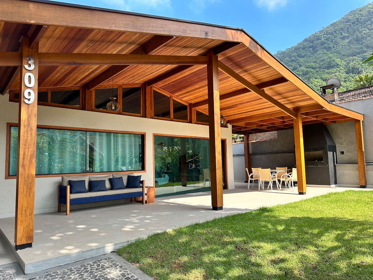 Um paraíso entre o mar e a Mata Atlântica. Ao lado do Porto e do Iate Clube Saco da Ribeira e à uma caminhada das praias do Lázaro, Sununga e Domingas Dias. Fogão e forno a lenha (perfeito para pizza), churrasqueira, freezer, mesa, redes e bancos para seu desfrute. Amplo espaço externo para crianças e pets se divertirem. ATENÇÃO: muitas casas e até apartamentos ficam sem água especialmente na temporada. Aqui temos captação própria de água da montanha, então não falta água!!