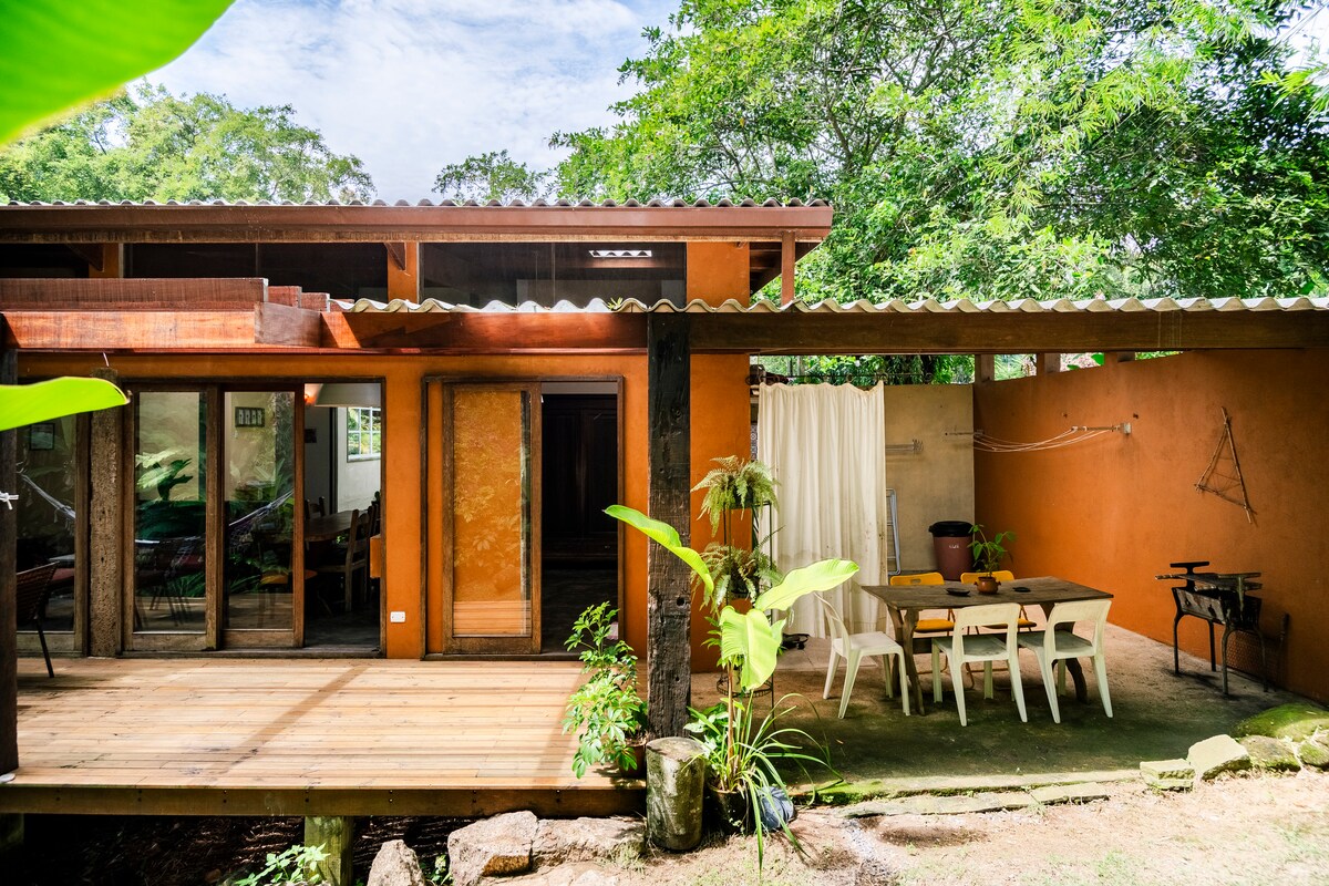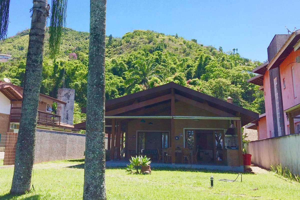 Casa rústica na praia Vermelha do Centro, a 3 minutos do mar, em rua tranquila e sem saída. Ensolarada e cercada por jardim tropical, localizada em meio à Mata Atlântica. São 3 quartos, sendo 1 suíte. Sala integrada à cozinha. Cozinha com geladeira, fogão, liquidificador, panelas, assadeiras e demais utensílios necessários para preparar as refeições. Há internet fibra óptica 350mb. Tv smart 43" É necessário levar lençóis, toalhas e demais itens de uso pessoal. Há travesseiros e mantas.