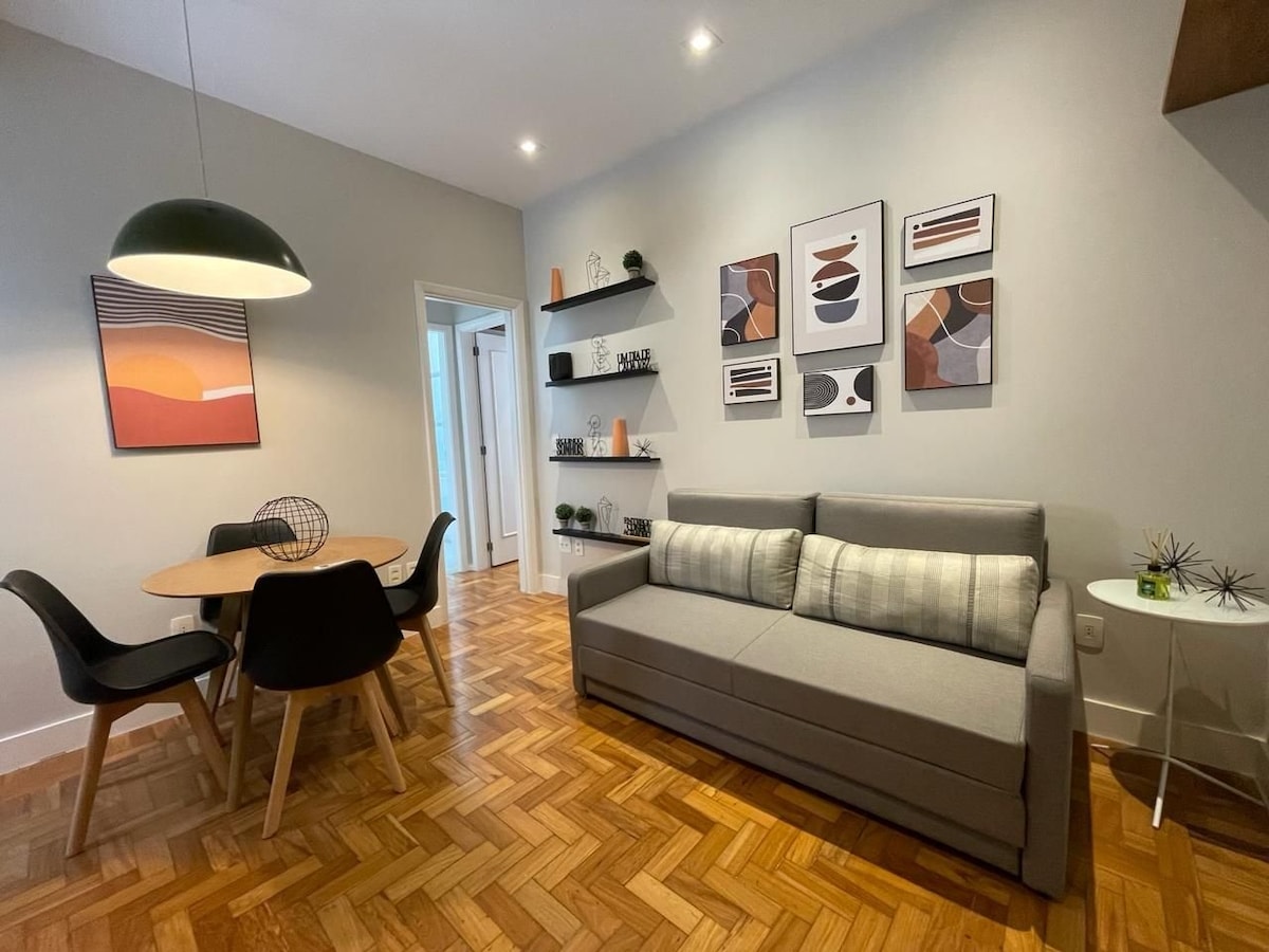 Apartamento foi todo reformado, decoração impecável, muito estilo e conforto para aproveitar o que tem melhor no Rio de Janeiro. O apartamento é um quarto e sala de 60 M², todo equipado, com Wi-Fi de alta velocidade, Tv smart, sofá-cama, perfeito para quem quer trabalhar de home office. Prédio residencial na melhor parte do Leblon. Apenas a 270 metros do Shopping Leblon, 260 metros do Metrô e 350 metros da praia.