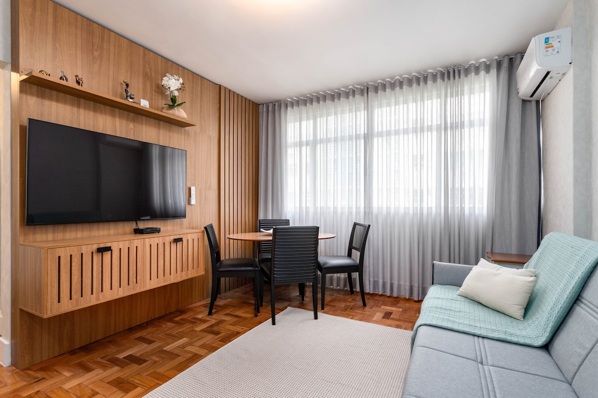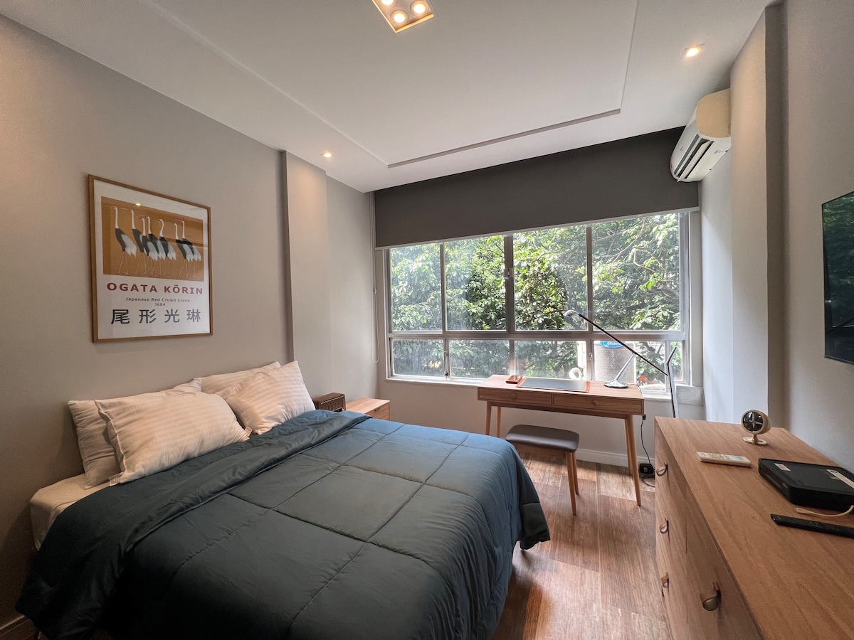 “ Apartamento charmoso, moderno e aconchegante. Super bem localizado, no coração do Leblon. Vizinho ao shopping Rio Design, Shopping Leblon, supermercados, farmácias e ótimos bares e restaurantes. Está localizado a 300 metros da praia e a 350 metros do metrô. Quarto espaçoso, silencioso e arejado com cama tamanho QUEEN e armários. Sala com sofá cama tamanho casal padrão, mesa p/ refeições ou para home office e SMART TV. Cozinha toda equipada. A/C split no quarto e na sala. Portaria 24h.