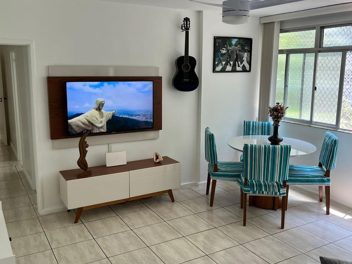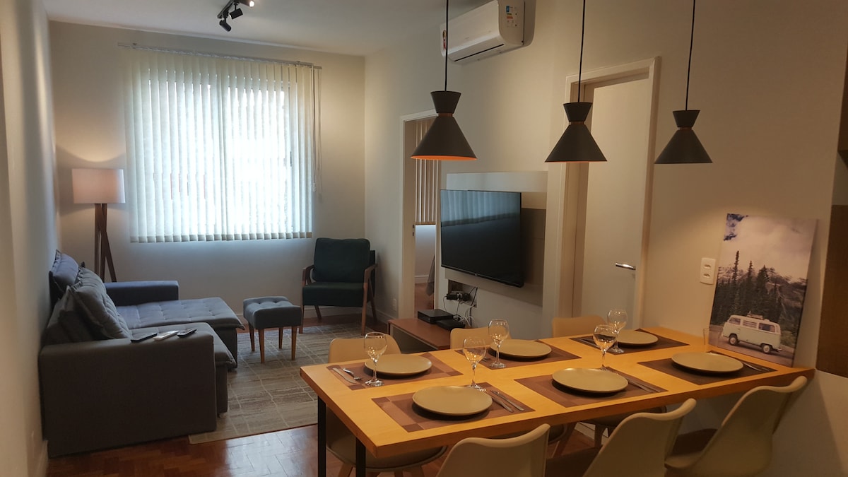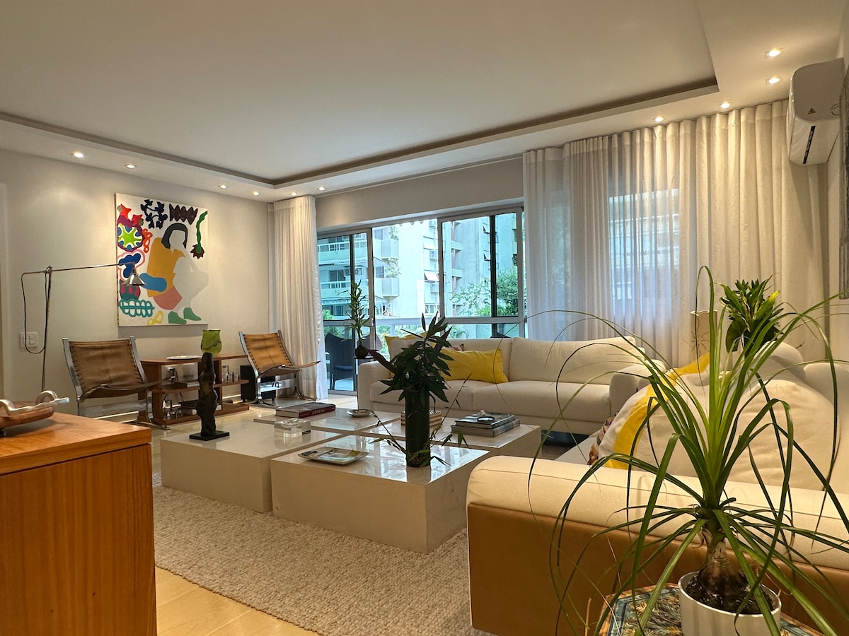 Apartamento para 4 personas en lo mejor de Ipanema, cerca del puesto 10 y a 2 cuadras de la playa. Cerca de restaurantes, supermercados, metro y centro comercial. Acogedor, cómodo, con estilo y muebles de diseño. Compuesto por sala con balcón (con sofá cama para dos personas), habitación suite con cama doble y baño principal, cocina, área de limpieza con baño de servicio y tendedero para ropa de playa. Aire acondicionado split (sala y habitación) y excelente internet (fibra) para teletrabajo.