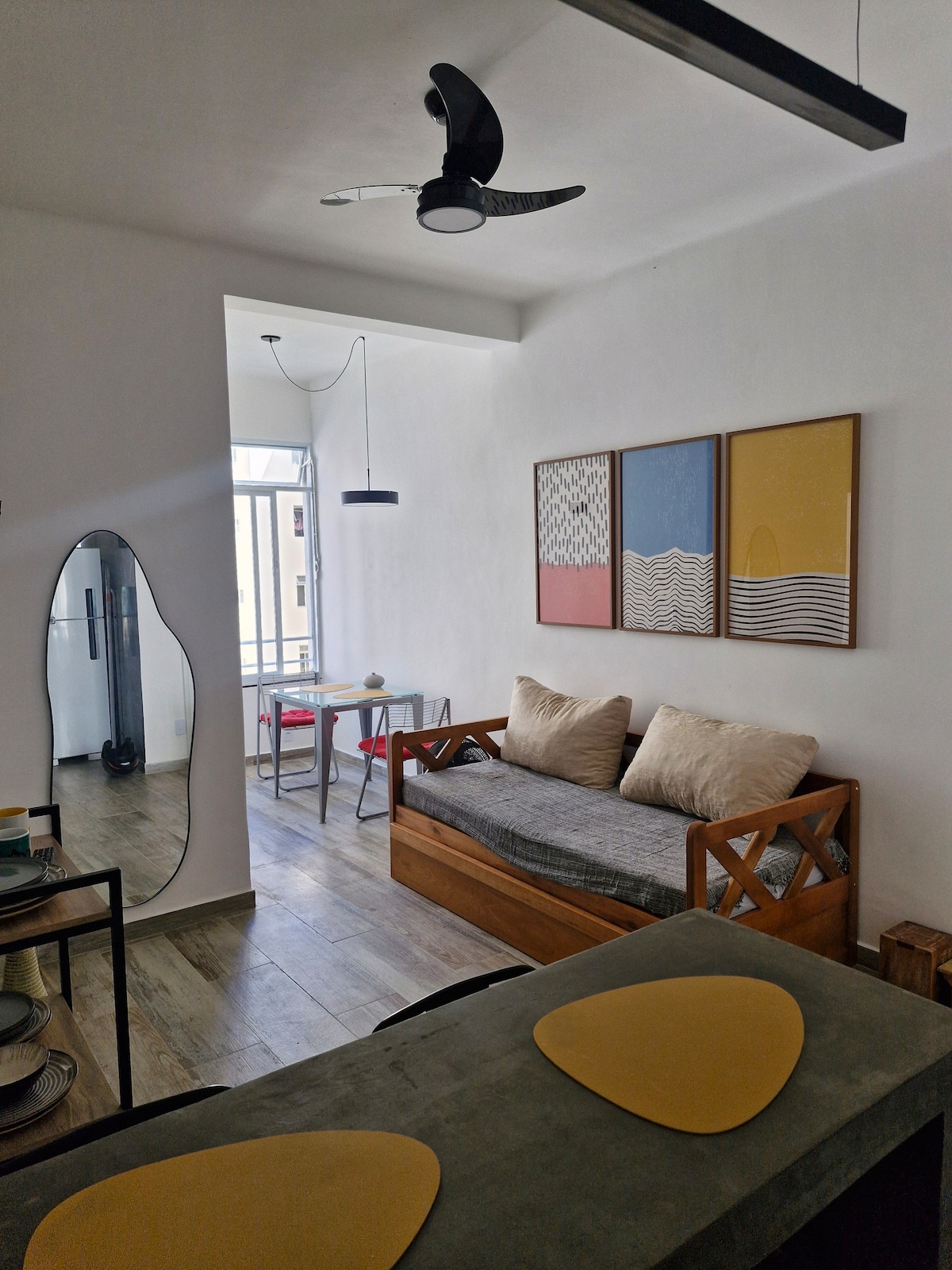 Enjoy a stunning and unique view of both the ocean and the mountain in a centrally located 2 bedroom renovated apartment in Leme, Copacabana ideal for families and couples. The apartment is cozy and has everything you need to make you feel at home. A very spacious and stylishly decorated living room, and a fully equipped apartment. One bedroom has a queen bed, the second bedroom has 2 single beds, and there are 2 more mattress/futons that can be placed in the living room if needed.