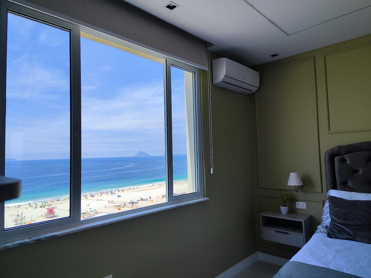 Exceptional luxury apartment with 2 suites on Avenida Atlântica, facing Copacabana beach, on the same promenade as the acclaimed Copacabana Palace Hotel. Very comfortable, with acoustic windows, full kitchen, living room with TV, air conditioning in all rooms, 24-hour doorman, 2 minutes from Rio Sul shopping mall and 10 minutes from Santos Dumont airport.