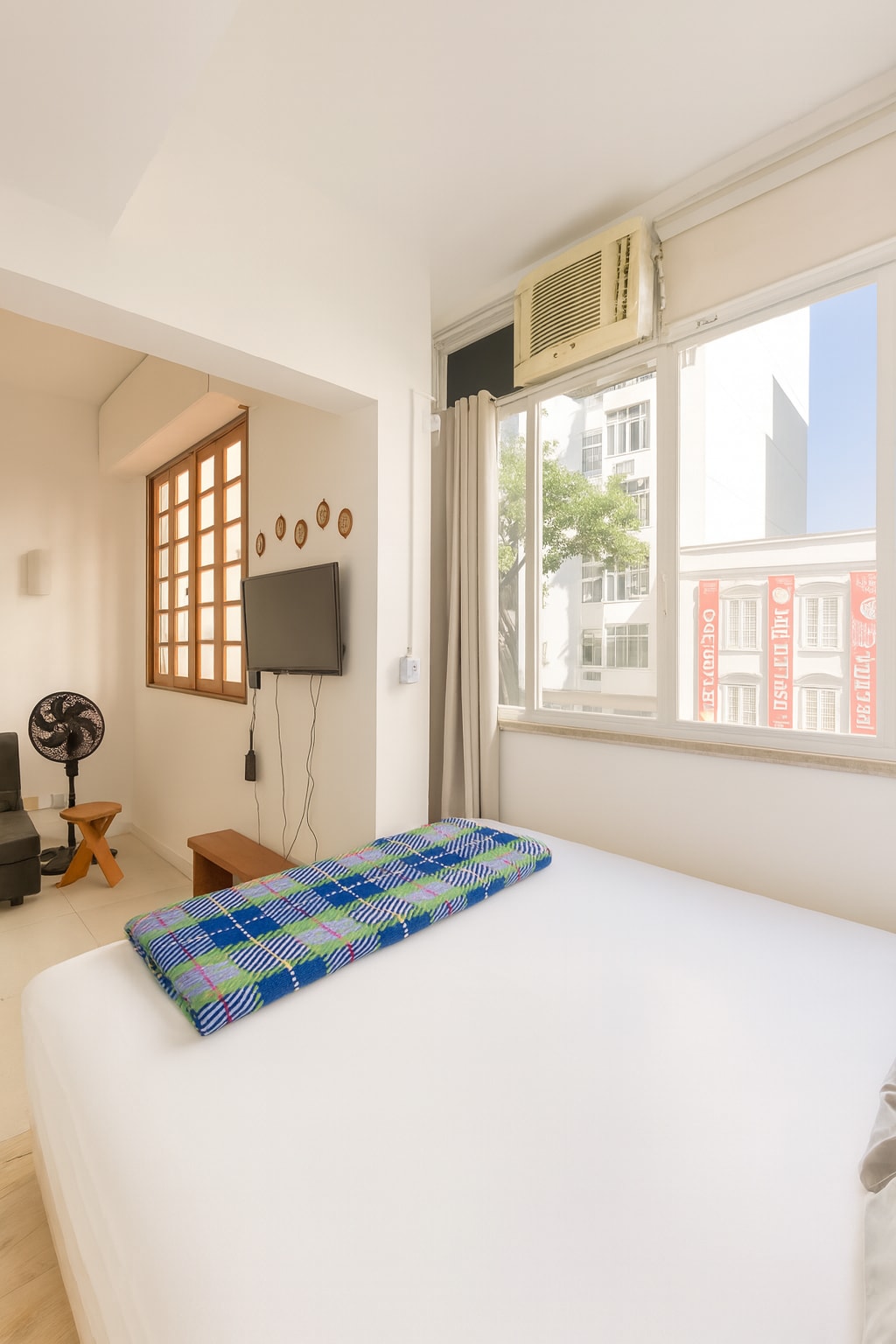 Curta uma estadia elegante neste lugar bem localizado na quadra da praia mais famosa do mundo, COPACABANA. (Entre o posto 3 e o 4). O Apt possui 1 quarto grande com uma aconchegante cama casal queen e 1 sofá cama, TV de 50 polegadas, armários embutidos, espelho grande, escrivaninha, iluminação direta e indireta, cozinha com fogão, geladeira, microondas, cafeteira e todos os utensílios. Banheiro completo e uma excelente ducha. Ar condicionado nos 2 ambientes. O prédio possui portaria 24 horas.