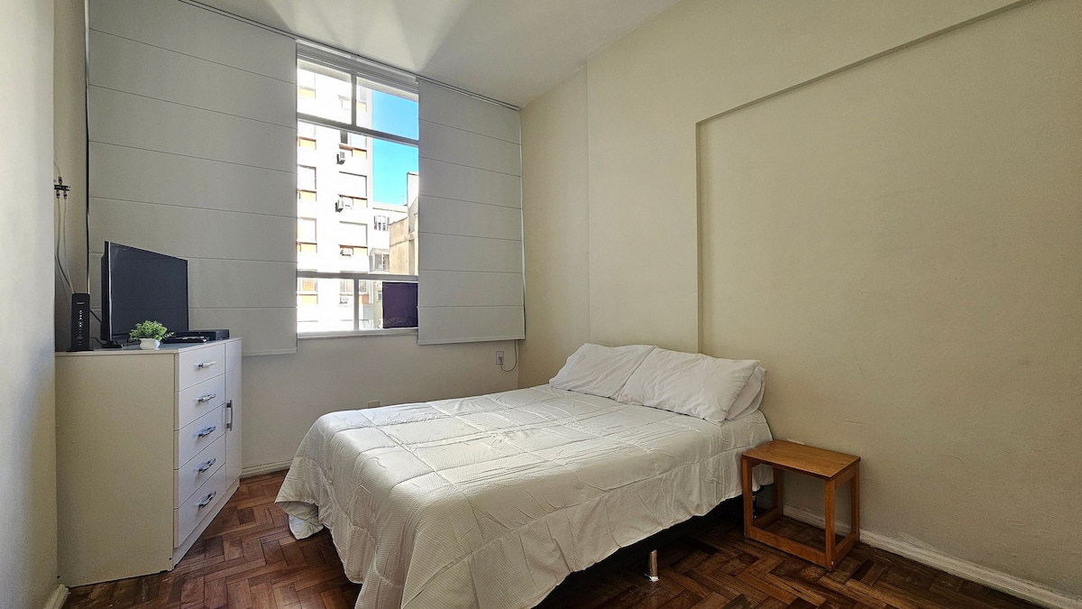 Cozy bedroom and living room at Leme, recently renovated, quiet and comfortable. Between the sea and the mountain, where Copacabana begins and a few meters from the beach, the building is in a residential street and has a doorman 24 hours. Well located, the neighborhood offers varied local commerce, excellent restaurants and public transportation. Ideal for both leisure and business travelers.