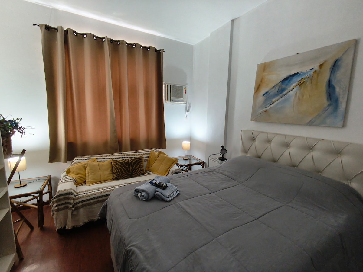 Aproveite uma estadia confortável e aconchegante no coração do Leme, você estará a apenas 10 segundos da praia o apartamento está localizado em um prédio familiar, seguro e extremamente silencioso, perfeito para o seu descanso após um dia no Rio. Apartamento ideal para duas pessoas, podendo acomodar até quatro pessoas. Roupa de cama, toalhas e Wi-Fi estão disponíveis.