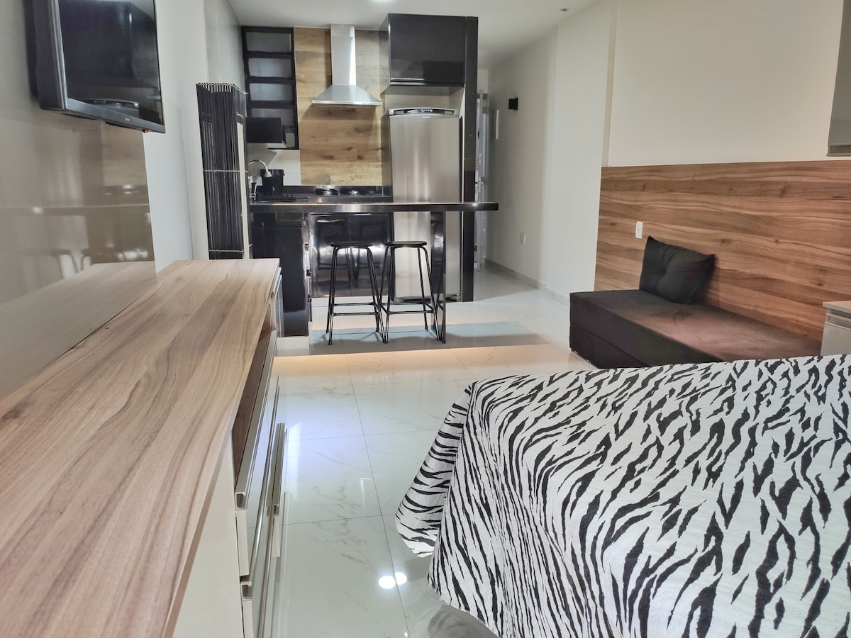 Apartamento fundos (loft) , recém reformado. Possui Smart-TV, wifi 5g de 250mb, tv a cabo, acesso ao Netflix/DisneyP pela Tv (conta não inclusa), ar-condicionado e ventilador de teto. Cozinha com microondas, torradeira, sanduicheira, geladeira, cafeteira normal e Nespresso (sem capsulas), fogão, panelas, copos, pratos e talheres. Roupa de cama e toalha de banho incluída. A 8 min do Metro e a 3 min da praia e com infraestrutura perto (lavanderias, mercados, restaurantes e etc).