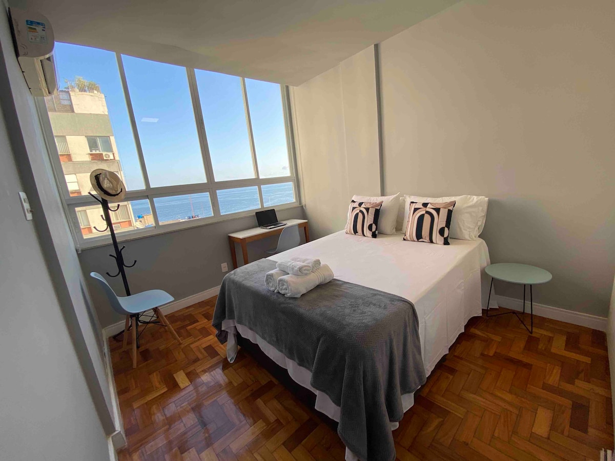 Relaxe neste espaço calmo, cheio de estilo e vista mar! Apartamento inspirado no conceito Loft boutique. Moderníssimo e funcional! 100% climatizado - com Ar Condicionados Split em todos os ambientes! O projeto e a decoração tem a assinatura de arquiteto renomado. Todo conforto e requinte que os hospedes merecem! Portaria 24h, edificio não possui acessibilidade para cadeirante Hospedem-se com um SuperHost. Venham para Copacabana / Leme! Alan Holanda