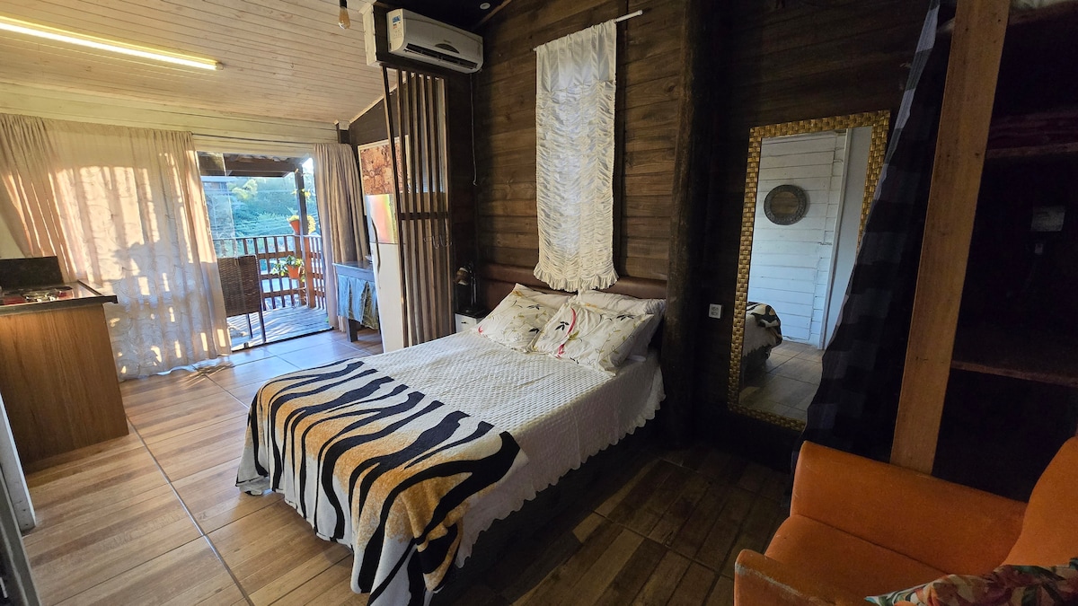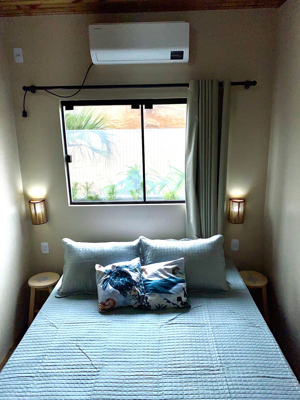 Amplo, confortável, privativo, acesso individual Ideal p/ casal jovem ou 4 pessoas, de bem com a vida 5 minutos da praia de carro (2 km); 1km do centrinho. Local tranquilo, seguro, fácil acesso ao Rosa e outras praias da região. -Quarto com cama box queen e Ar Condicionado Q e F -Sala com TV 32 Smart, bicama p/ 2 solteiros, ventilador -Varanda deliciosa com rede e linda vista para montanhas -Cozinha completa e funcional -Jardim e churrasqueira (uso comum) - Wi-fi estável fibra 100mb