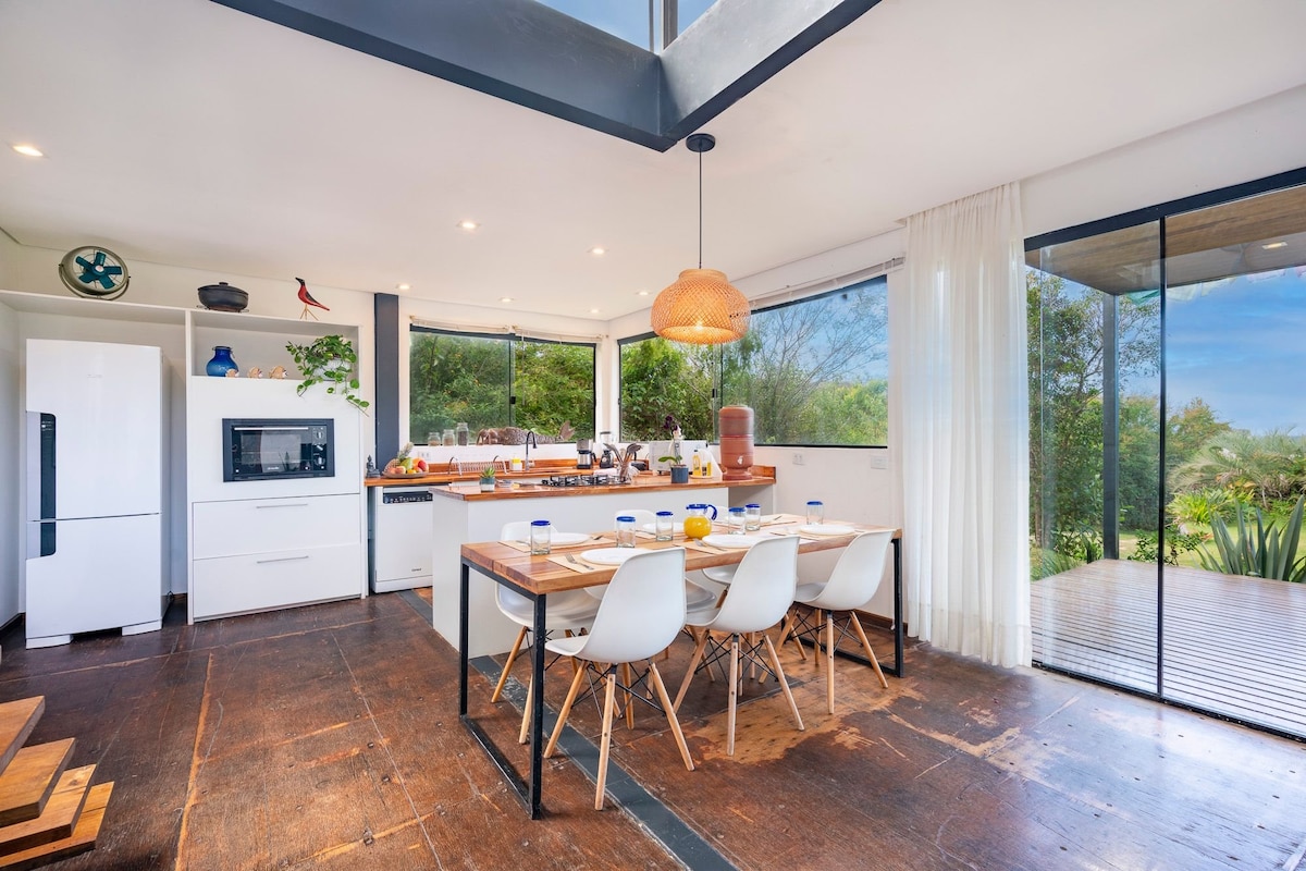 Uma casa nova, moderna, totalmente equipada, no meio da natureza, com uma vista espetacular de uma das praias mais lindas do Brasil. Está localizada no canto Sul da Praia da Silveira, em Garopaba, Santa Catarina, apenas 1 km da praia - um paraíso natural, com muito conforto!