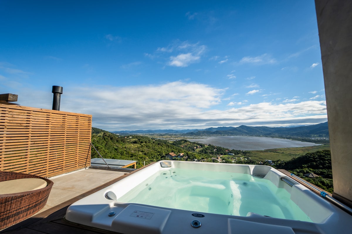 Casa com muito estilo e uma vista de tirar o fôlego! Para quem busca as melhores experiências, conforto, sofisticação, segurança e tranquilidade! Três suítes + Suíte Master com cama King size, lareira de etanol, frigobar e banheira de hidromassagem. Spa aquecido no deck, mesa de sinuca, ar condicionado em todos os quartos e sala, wifi, churrasqueira interna e externa, adega, cervejeira, lava louça e lava roupas. Adoramos Pets, porém não permitimos cachorros de grande porte.