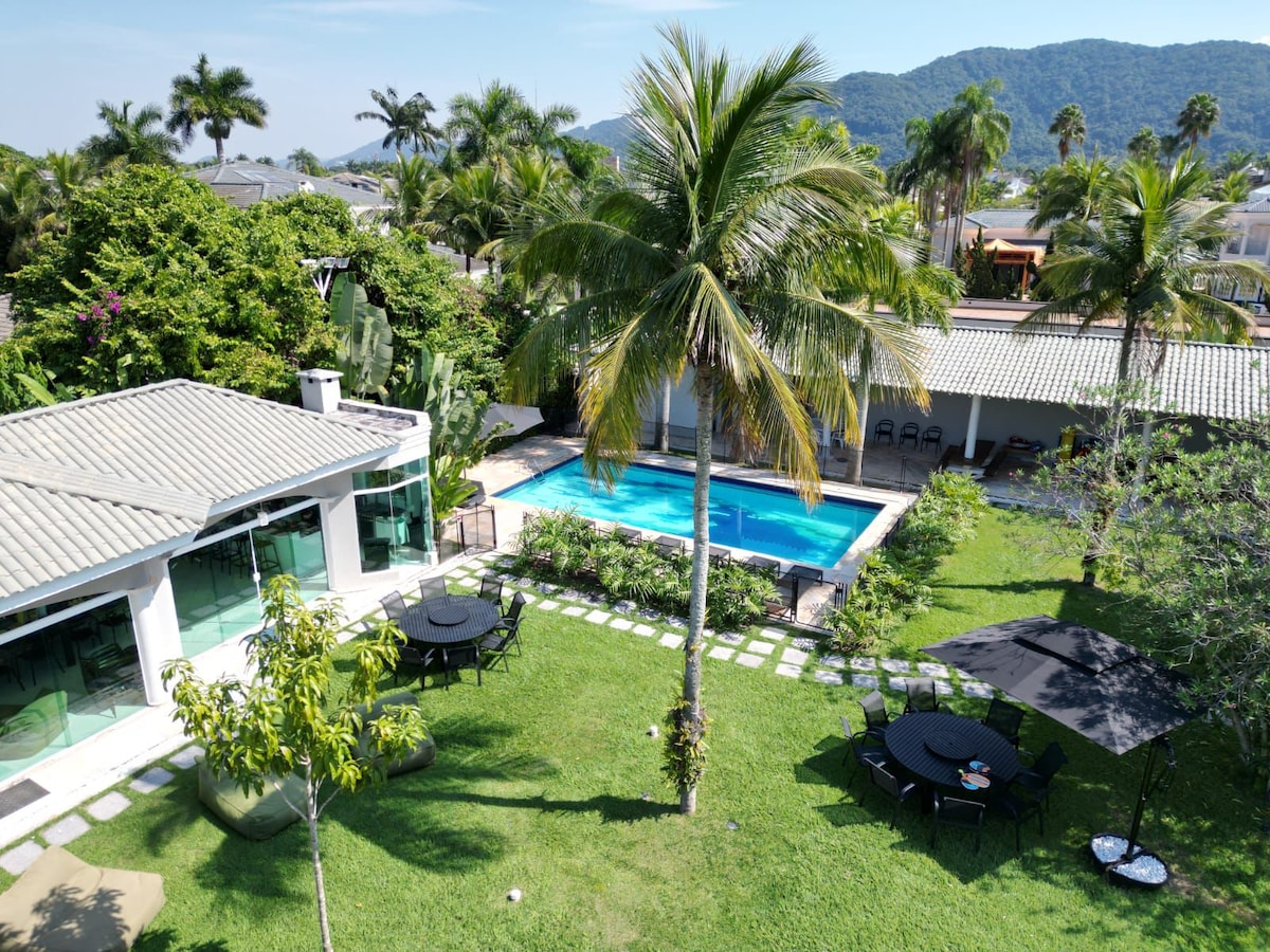 Casa a 400 metros da praia ,Piscina, área verde com gramado amplo, área de jogos, churrasqueira, forno de pizza , 6 dormitórios com 3 camas de casal e 10 camas de solteiro(4 com ar condicionado), mercado Pão de Açúcar a 100 metros,,rua toda em calçamento (mesma rua do Condomínio Acapulco a mais segura de Guarujá),3 vagas de estacionamento