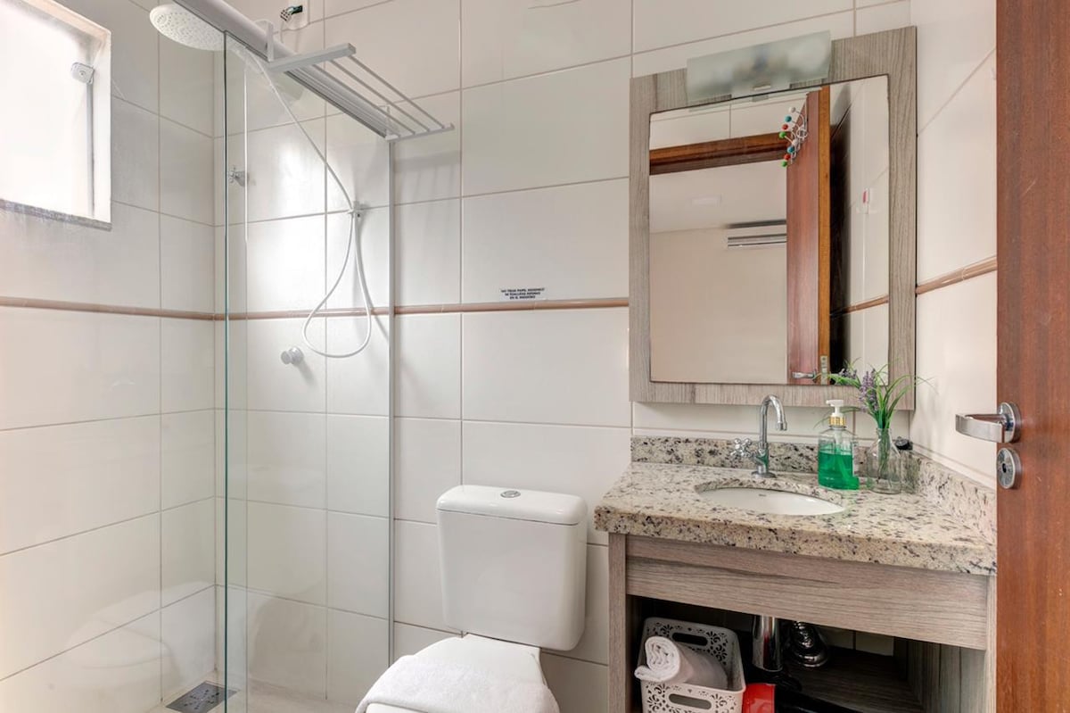 Quarto 2: Inclui uma cama box casal, frigobar, ar condicionado e uma smart TV de 42” com acesso livre ao Netflix. O banheiro privativo dispõe de chuveiro a gás, secador de cabelos, além de toalhas de banho, rosto e piso.