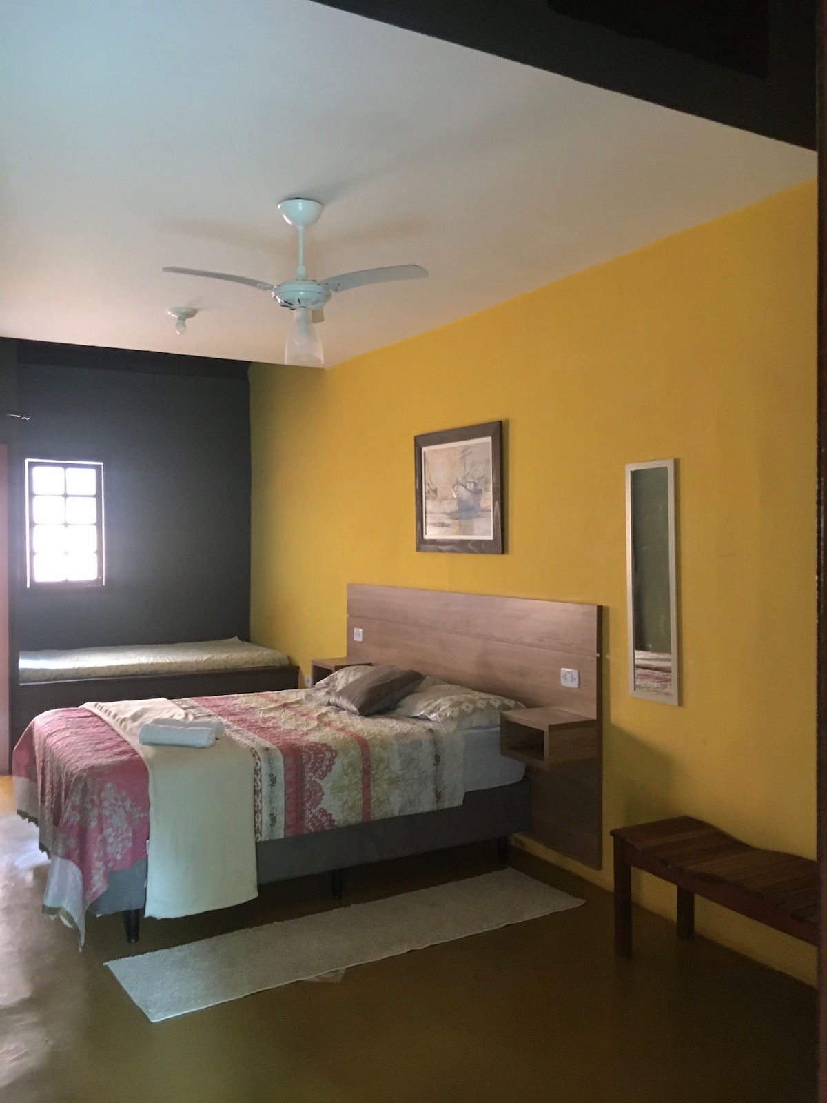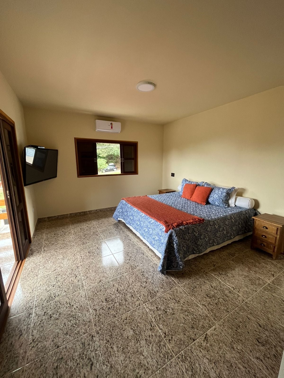 A suíte tem ar condicionado, TV e no final do 2024 um frigobar.