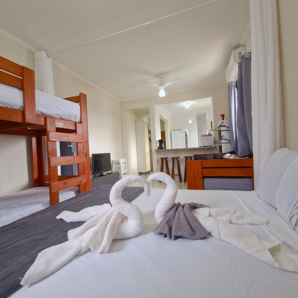 Novíssimo apto aconchegante de 52m2, distante 500 metros da praia, com 2 dormitórios, sala ampla, ar condicionado, internet com Wi-Fi, cozinha completa, sacada com churrasqueira, 2 vagas de garagem privativas, brinquedoteca e piscina compartilhada entre proprietários e hóspedes. A churrasqueira é privativa e tem um grande diferencial, você poderá fazer seu churrasquinho com vista para as montanhas e aproveitando ao máximo desse momento com a família e amigos.
