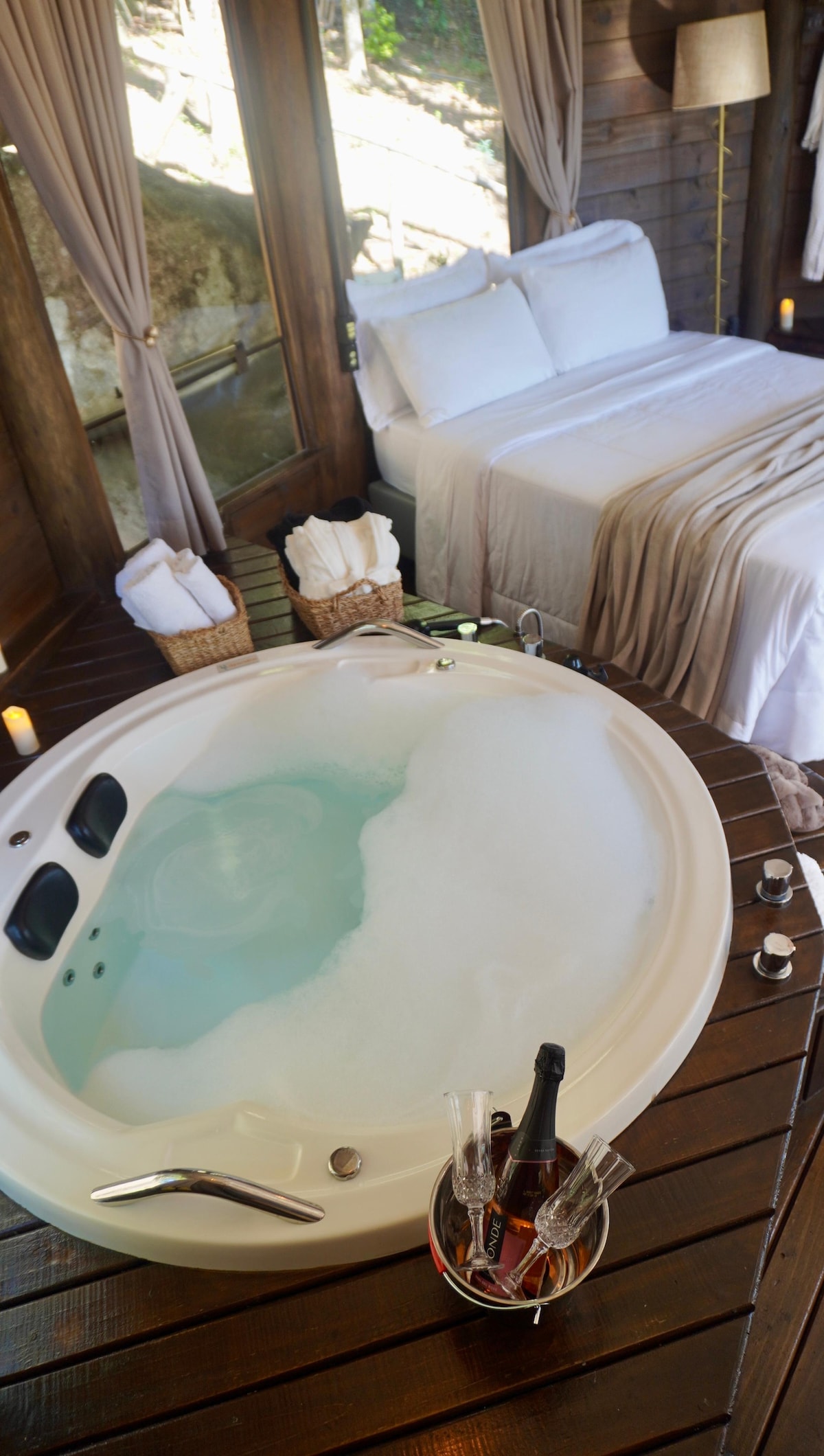 Relaxe em uma cabana exclusiva em Florianópolis com hidro privativa, jardim aconchegante e todo o clima romântico que você procura. Estamos em Vargem Pequena, no norte da ilha, perto de praias, restaurantes e pontos turísticos, mas em um cantinho reservado para garantir tranquilidade. O refúgio ideal para casais! Com a hospedagem inteira só para vocês, um ambiente privativo, silencioso e acolhedor e com a possibilidade de adicionar pacotes românticos (cobrados a parte).