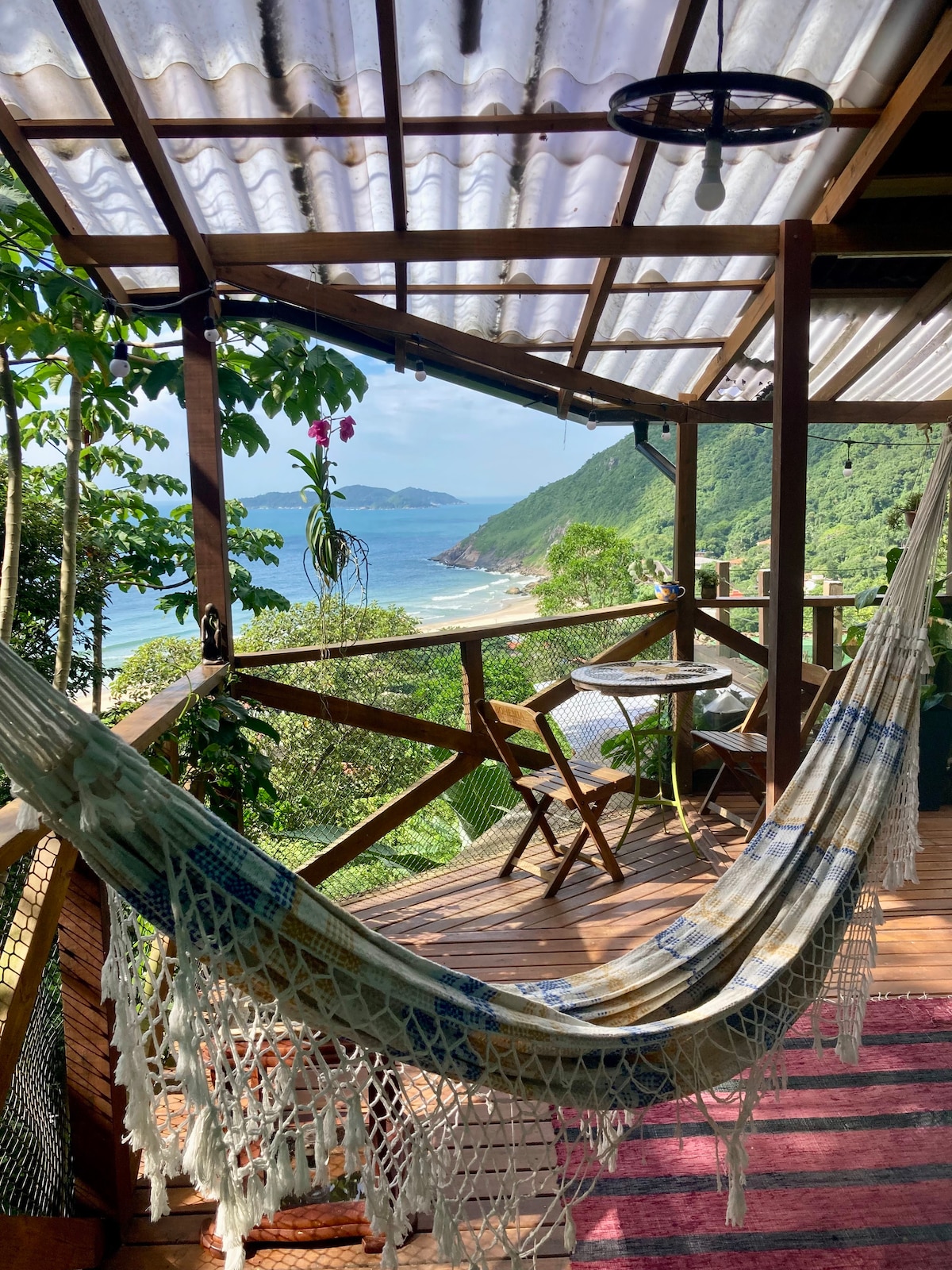 Cabana estilo TreeHouse, vista panorâmica, cercado por natureza é o diferencial desta exclusiva cabana! Com uma varanda acima da linha das arvores voce tera uma vista paradisíaca do oceano, mata nativa, canal cristalina e um vilarejo simpático de pescadores. Não a acesso a carros no morro, tornando se um lugar perfeito para amantes da natureza, aventureiros e quem ama praticar trilhas e esportes aquáticos. Localizado 15 minutos a pé da praia, estacionamentos, restaurantes e transporte público.
