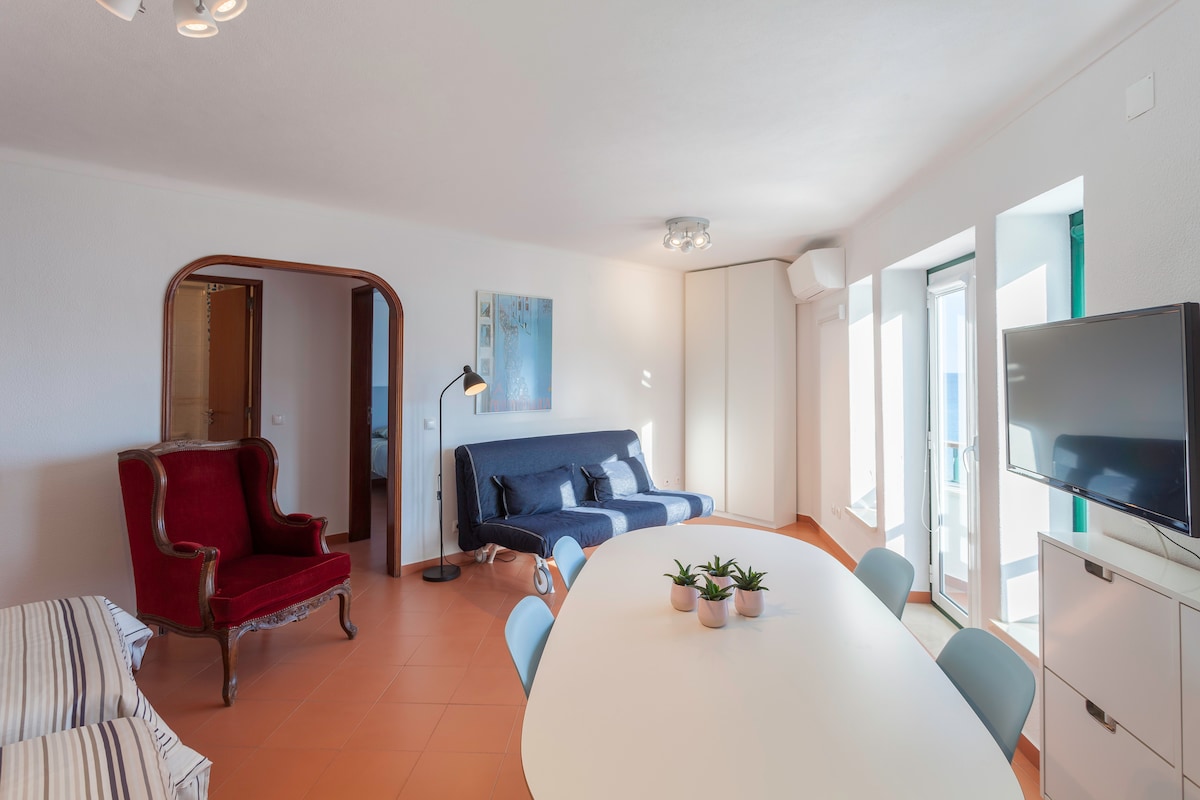 This renovated apartment is a gem on the Sesimbra beach line, with a splendid view over beach, sea and in the distance the harbor. Surrounded by cafés, restaurants and small shops, it is ideal for people who want to integrate into the daily life of this fishing village. Enjoy sun, sand, sea and much more. There is no private terrace , but you can enjoy your meal on the street near the entrance (see first photo). Free parking in private garage at 5 min. walking distance (no climbing). READ MORE »