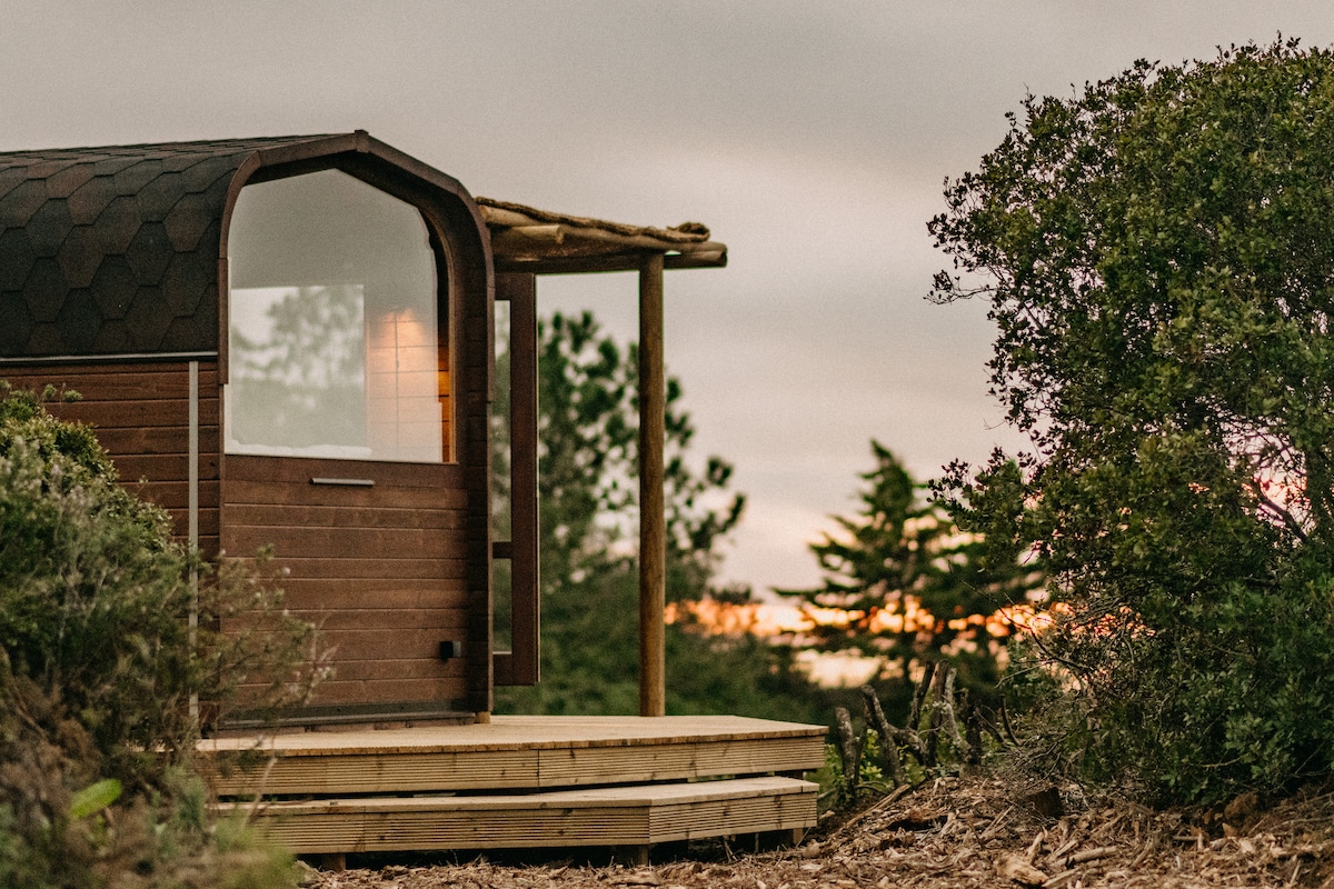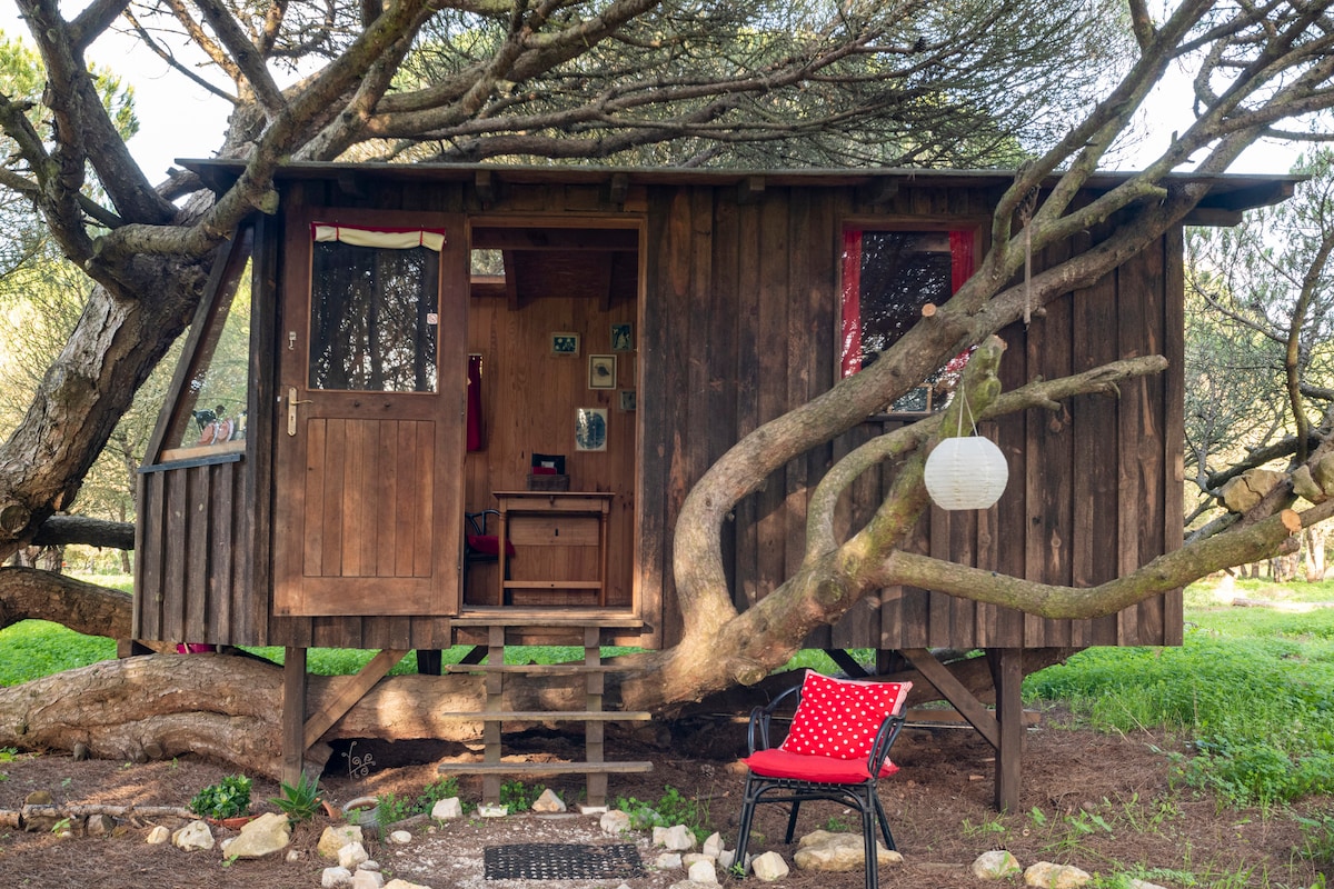 Beautiful self-built wooden tree house situated on top of a horizontally-grown pine tree. Only a 5 minute walk from the sea which borders the property. Plenty of privacy around the house and a sunbed for lazing about. The land is part of the natural park, has stunning views across the ocean & amazing sunsets. The cabin is decorated with handmade details, has a comfortable double bed, a fridge & gas stove. We recently installed hot water in the outside shower!