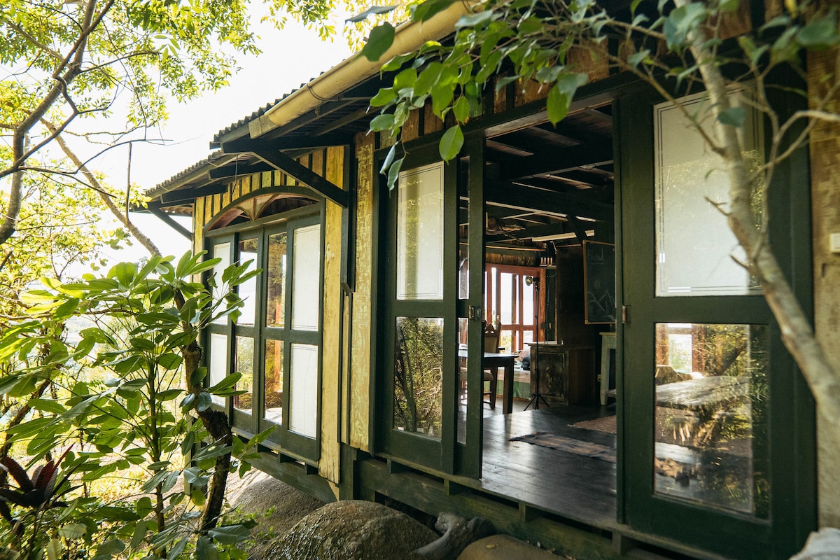 Observatório natural no alto da montanha com uma arquitetura em simbiose com a natureza. Visual deslumbrante para a Lagoa e o Mar, com nascer do sol e da lua. Fogueira para ver as estrelas. Conforto com requinte e privacidade. Rodeada pela mata atlântica, águas da cachoeira, piscina natural com água da nascente. Acesso somente via barco (Lindo trajeto pelas águas da Lagoa-ca.15 min.) ou via trilha. Check in presencial. Um paraíso espera por você!