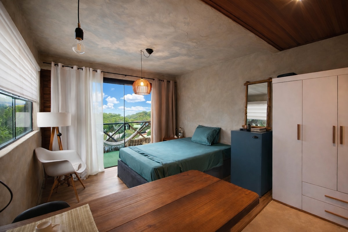 *Please review photos & description BEFORE BOOKING* Modern cozy studio in Villa Mole, w/BEST Lagoa sunset view. Located 5min walk to famous Lagoa (bars, food, music) & Praia Mole (serviced, surfers). Guests have PRIVATE STUDIO --private digital entry, FULL bed, kitchenette w/half fridge (& microwave, hot plate, pots/pans, utensils), dining table, new bathroom (hot shower, towels), balcony. Guests SHARE access to social/external areas: JACUZZI & deck, BBQ/cafe, firepit, gym, laundromat, iron