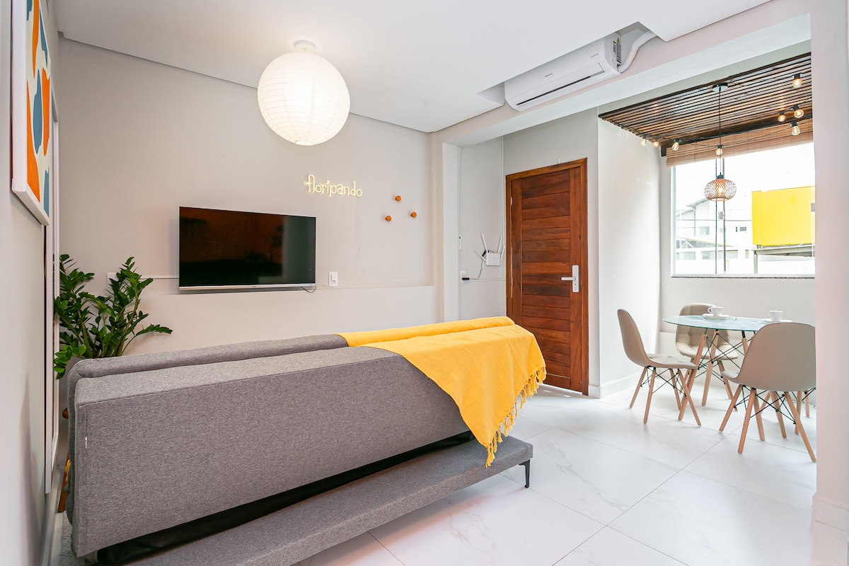 New, clean and comfortable studio, with air conditioning and just 30 meters from the beach. It is located between the beaches of Campeche and Morro das Pedras. The Studio has a 32-inch Smart TV, 200Mb Wi-Fi, a full kitchen - fridge, freezer, stove, gas oven, microwave oven, electric oven and coffee maker. The living room is integrated and the very comfortable sofa bed can accommodate a third guest. The beach is quiet, ideal for surfing, diving, kitesurfing or just relaxing by the shore.