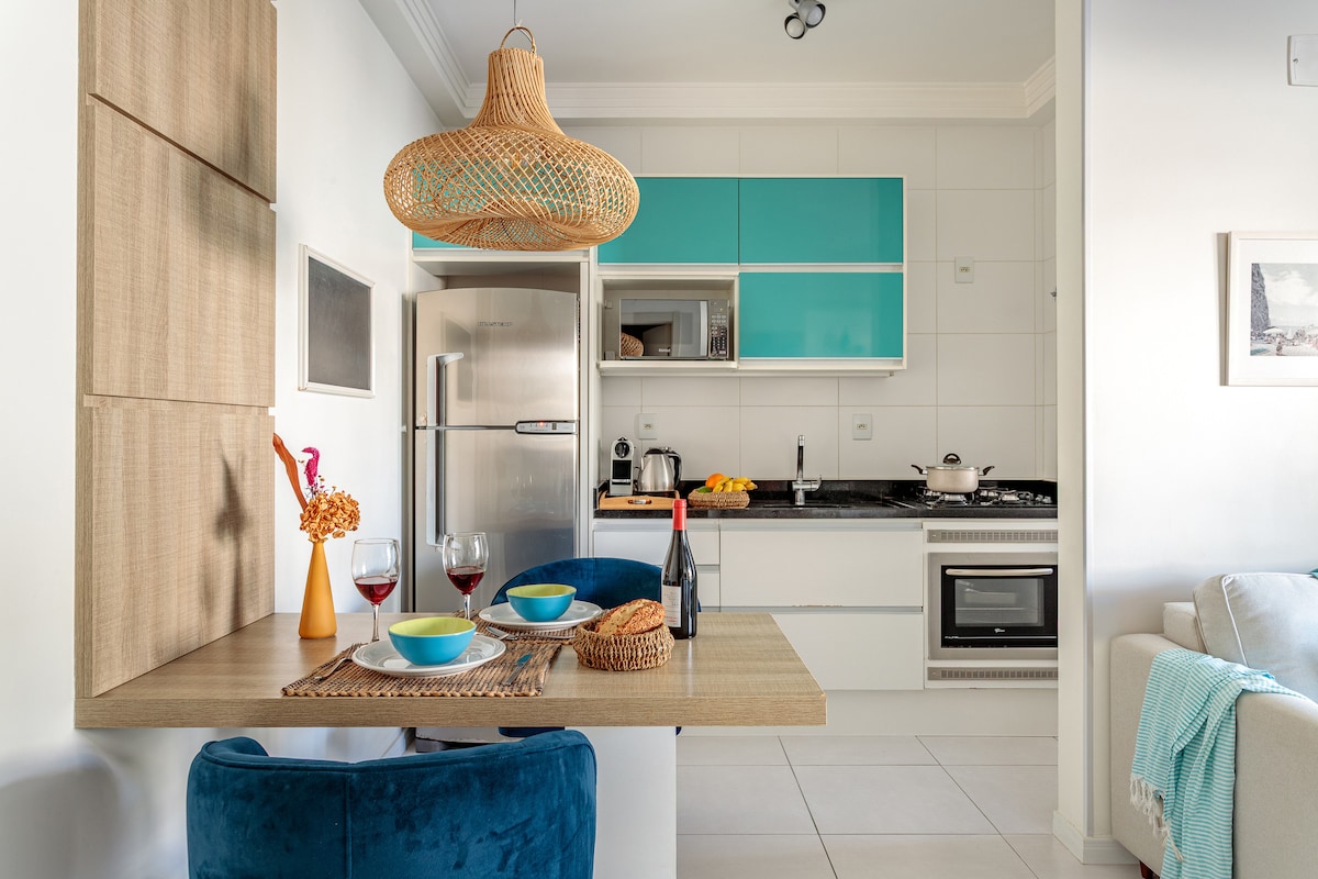 Apartamento aconchegante e com muito "borogodó" em condomínio Thai Beach Home Spa, alto padrão FRENTE MAR, piscina aquecida e spa. 1 dormitório, sala integrada à cozinha, ambientes decorados e equipados para sua estadia ser perfeita. Espaço acomoda até 4 pessoas, 2 na cama queen e até 2 no sofá cama amplo da sala. Lazer disponível: - Piscinas e jacuzzi ao ar livre - Piscina AQUECIDA coberta e SPA quentinho; - Academia; - Sala de massagens; - Parquinho para crianças; - Cinema