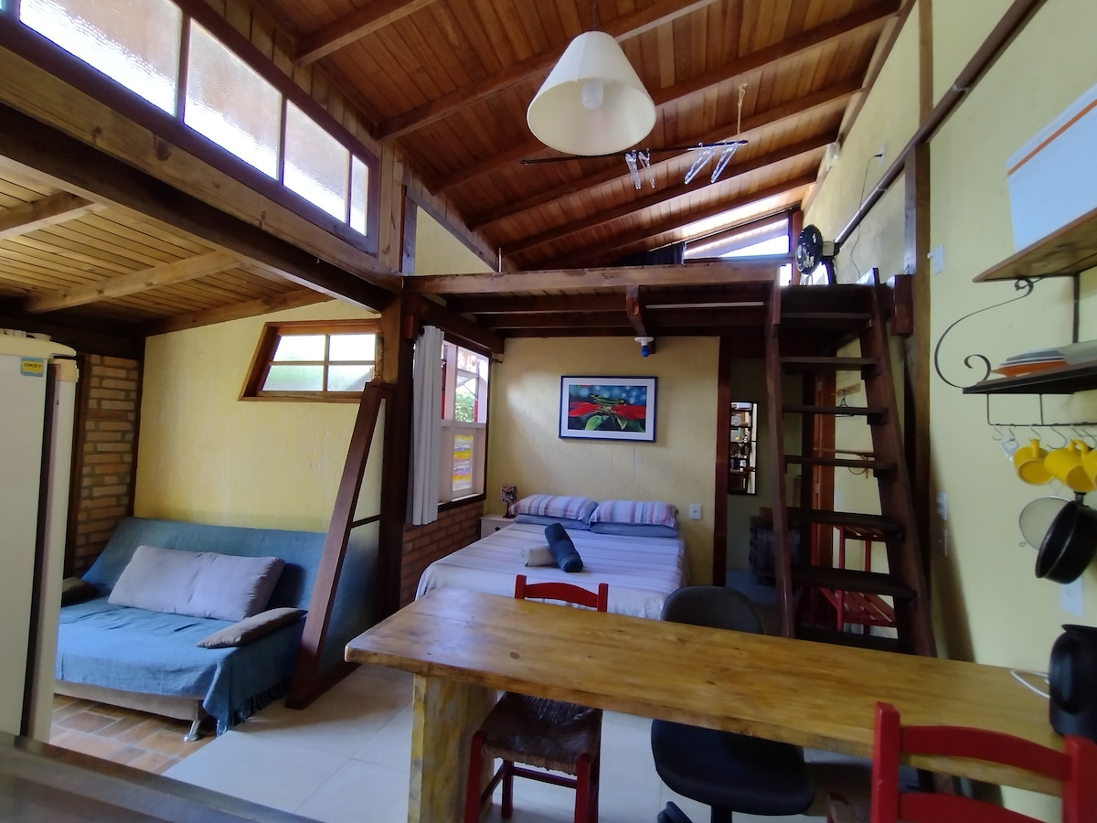 Lindo Studio a 50 mts da praia do Campeche, com ar condicionado quente e frio, amplo iluminado e bem ventilado! Ótimo pra quem gosta de ver o sol nascer no mar! Aqui você pode fazer uma caminhada na praia até mesmo antes do café da manhã Acomoda 4 pessoas , 2 em cama de casal e 2 no mezanino em colchões de solteiro O studio é geminado com minha casa mas tem entrada independente,não tem garagem mas é muito tranquilo estacionar na rua. Fica localizado na região da Lomba do Sabão.
