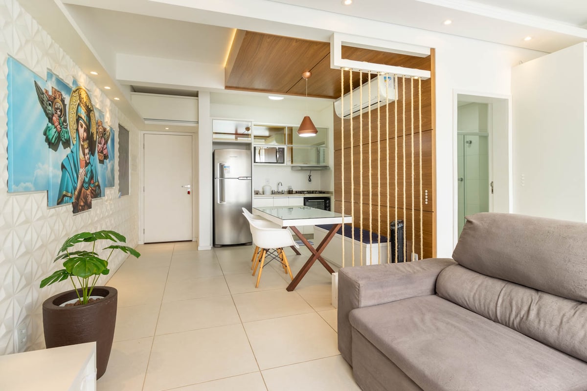 Apartamento aconchegante e com muito "borogodó" em condomínio Thai Beach Home Spa, alto padrão FRENTE MAR, piscina aquecida e spa. 1 dormitório, sala integrada à cozinha, ambientes decorados e equipados para sua estadia ser perfeita. Espaço acomoda até 4 pessoas, 2 na cama queen e até 2 no sofá cama amplo da sala. Lazer disponível: - Piscinas e jacuzzi ao ar livre - Piscina AQUECIDA coberta e SPA quentinho; - Academia; - Sala de massagens; - Parquinho para crianças; - Cinema