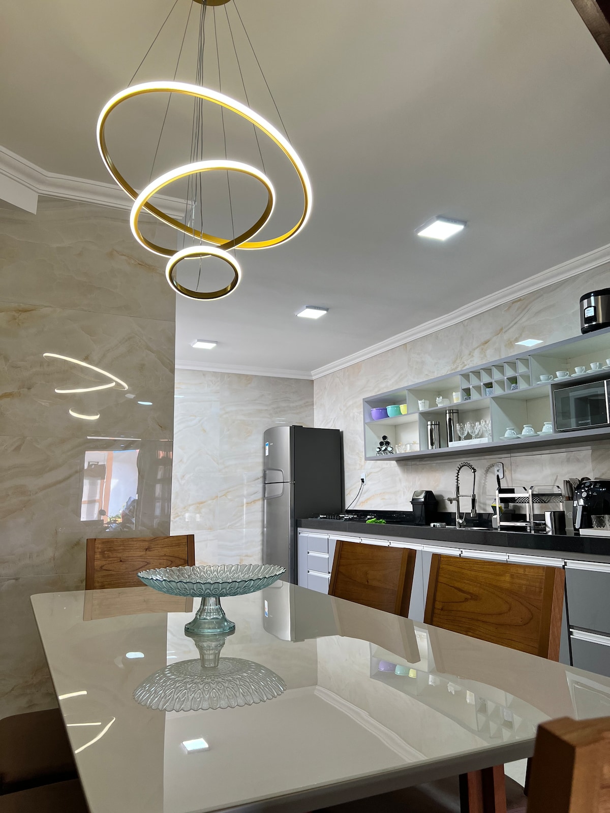 Apto térreo 1 suíte Cama king + 2 camas solteiro auxiliares embutidas Sala com sofá-cama e cama extra (converte 2 camas sobressalentes) 2 banheiros c/aquecedor solar e elétrico Espaço home office mesa e cadeira Internet exclusiva c/ roteador próprio Cozinha conjugada completa TV Smart 43' sala e TV quarto Ar condicionado split Ventilador de teto Churrasqueira privativa, pia, mesa e cadeiras Área de serviço exclusiva c/ ducha, tanque, varal 1 vaga estacionamento interno descoberto Portaria 24h