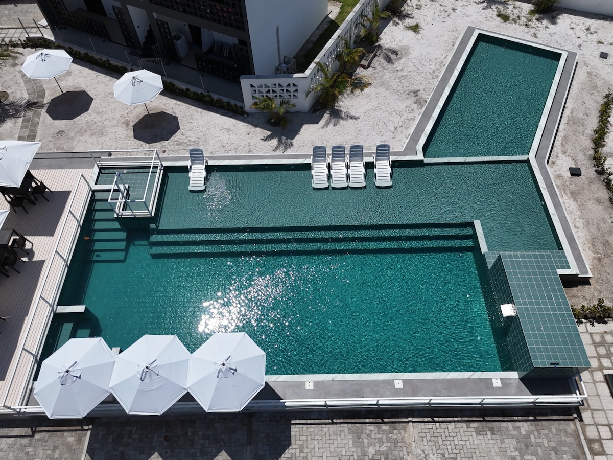 距离海滩100米的全新单间公寓,配备壮观的游泳池