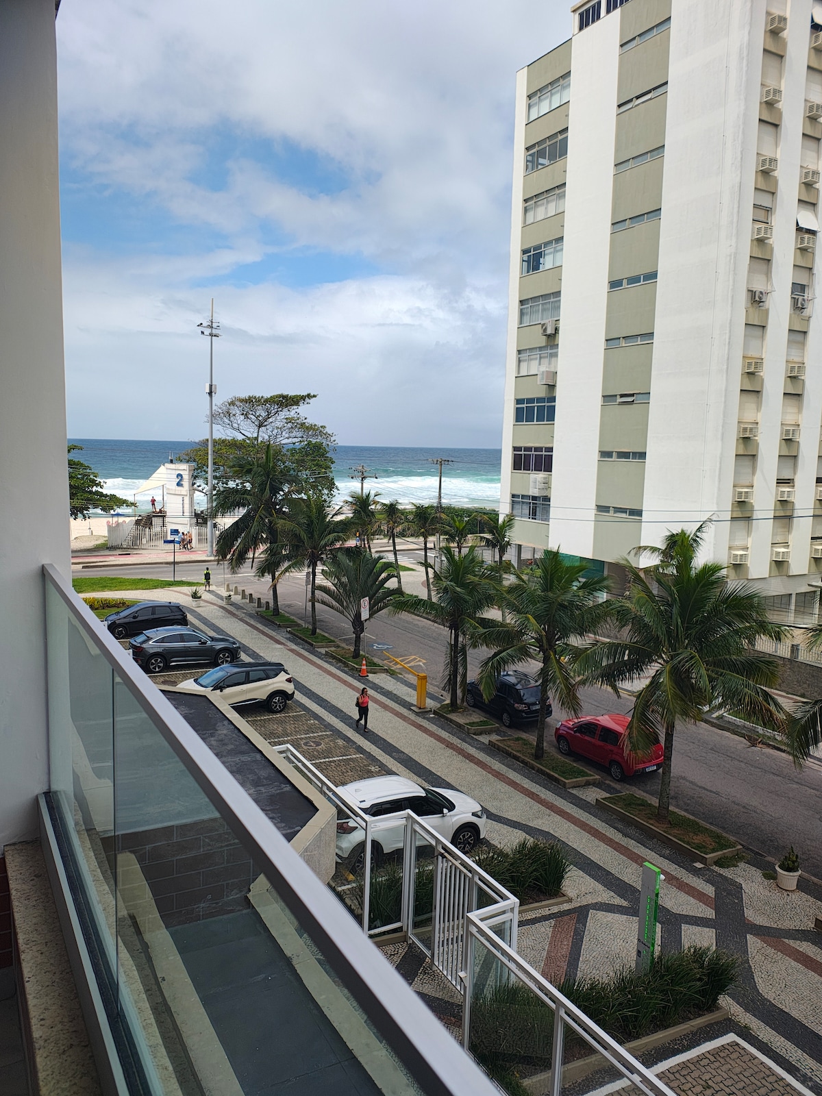 Ap à beira-mar na Barra da Tijuca, com varanda e vista espetacular na melhor praia do Rio de Janeiro, entre o posto 4 e 5. São 2 quartos:1 suíte com ar condicionado, tv, banheiro e 1 quarto com 2 camas de solteiro e ar condicionado e ventilador. Sala, banheiro social e cozinha completa. O condomínio tem área de lazer com parque infantil, quadra e mini mercado. Local seguro com agradável calçadão, bares, restaurantes, quiosques de praia, mercado e lojas onde dá para ir a pé.