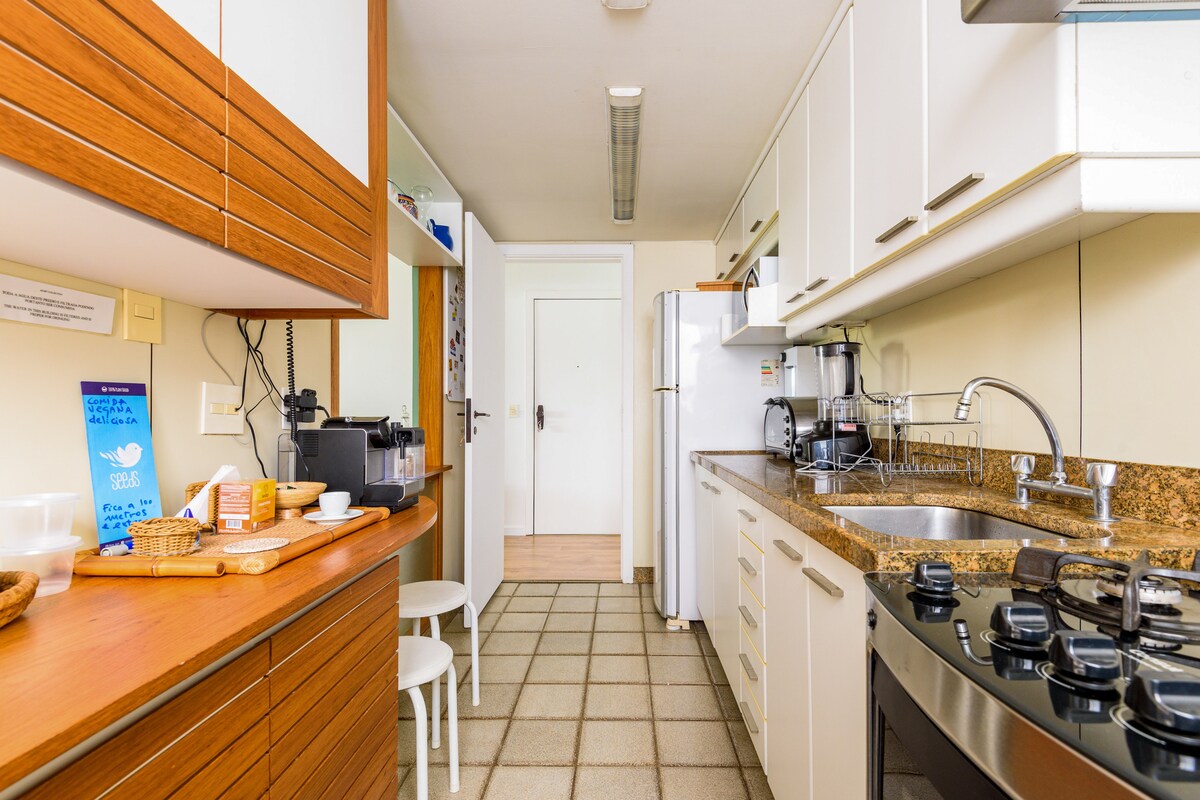 Flat fabuloso, recém reformado, mobília nova, aconchegante. Localizado no 26o com janela do piso ao teto para desfrutar da vista sensacional, digna de um poster. Cozinha totalmente equipada, ar condicionado split e smart TV no quarto e na sala para melhor conforto. Infraestrutura do condomínio com piscina, sauna, academia, restaurante e arrumação diária inclusa no valor da diária. Super bem localizado. A poucos metros da praia e poucos passos do Shopping Leblon. Para amar e retornar!