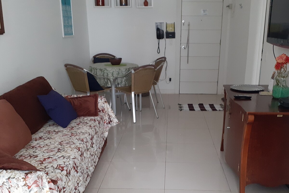 Flat/APT inteiro de 55 m² - Varanda vista lateral p/ o mar, ao lado do Hotel Windsor Barra/Oceânico da Av. Lúcio Costa. Sala, 1 quarto, cozinha e 1 banheiro, Wi-Fi. Sala com TV a cabo/ sofá-cama casal /mesa/vent. de teto/ar condicionado. Quarto: Cama de casal c/cama de solteiro embutida/+2 colchão de solteiro extra/vent. de teto/ar condicionado. Cozinha: Geladeira/micro-ondas/fogão/liquidificador/cafeteira/sanduicheira/utensílios. Rede de proteção na varanda, garagem, piscina, Portaria 24hs.