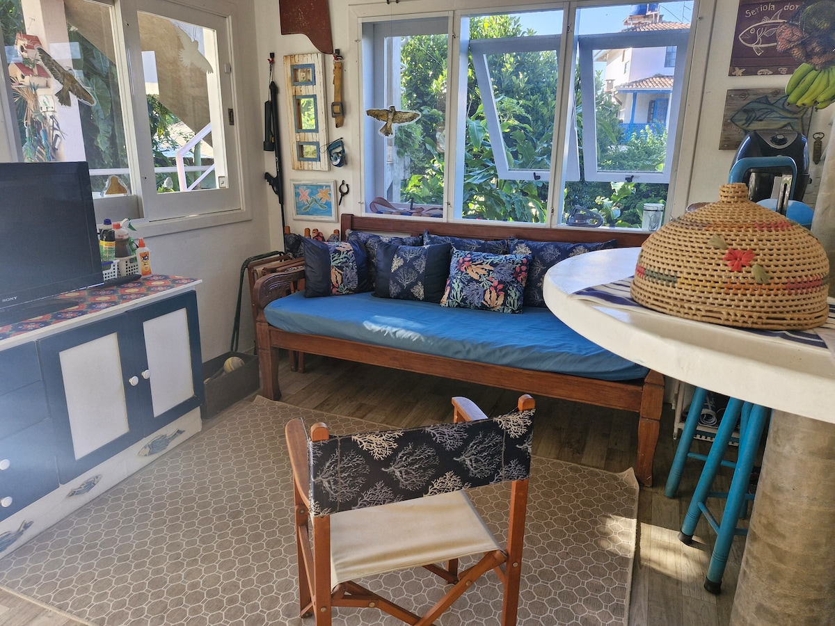 Relaxe nesta acomodação tranquila, aconchegante e com vista para o mar, à 3 minutos da praia da enseada, calma, ideal para banho. Casa com entrada compartilhada. Ambiente com muita natureza. Não aceitamos som alto, bagunça e animais. Na vila tem criança, uma gata e um cachorro dócil. Acesso rua de terra, não tem garagem, a rua é bem tranquila para deixar o carro. Não apropriado para crianças,pessoa com dificuldade de locomoção,tem escadas, e varanda sem proteção,motivo vista.