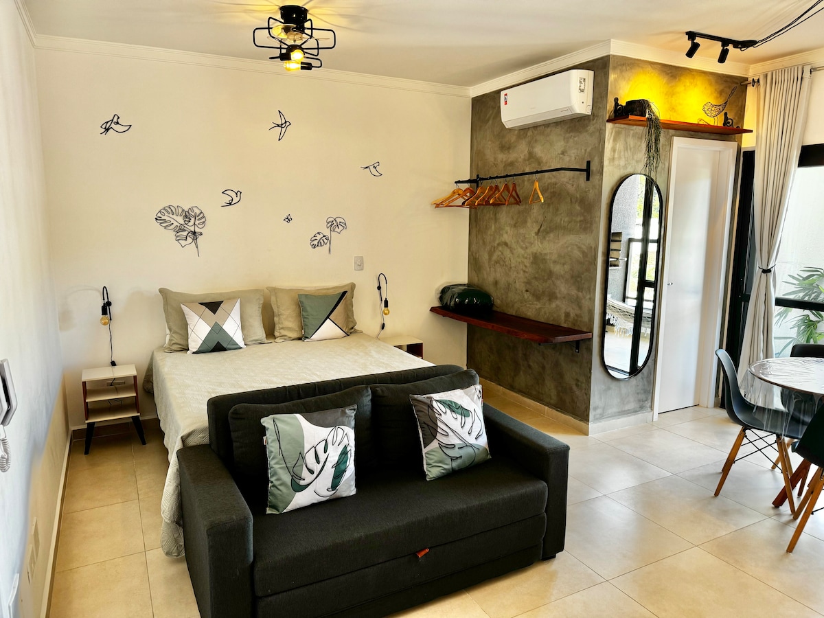 Charmosos estúdios self catering na linda praia do Prumirim. Entrada independente, pátio privado, cozinha totalmente equipada, cama queen size de alta qualidade, sala de estar confortável. Tudo projetado com qualidade, conforto e estilo. Grandes janelas panorâmicas que vão fazer você se sentir entre as copas das árvores! Este é um lugar mágico para quem procura uma fuga romântica à beira-mar conectando-se à natureza sem comprometer seu conforto. Tudo meticulosamente limpo, sanitizado e seguro!