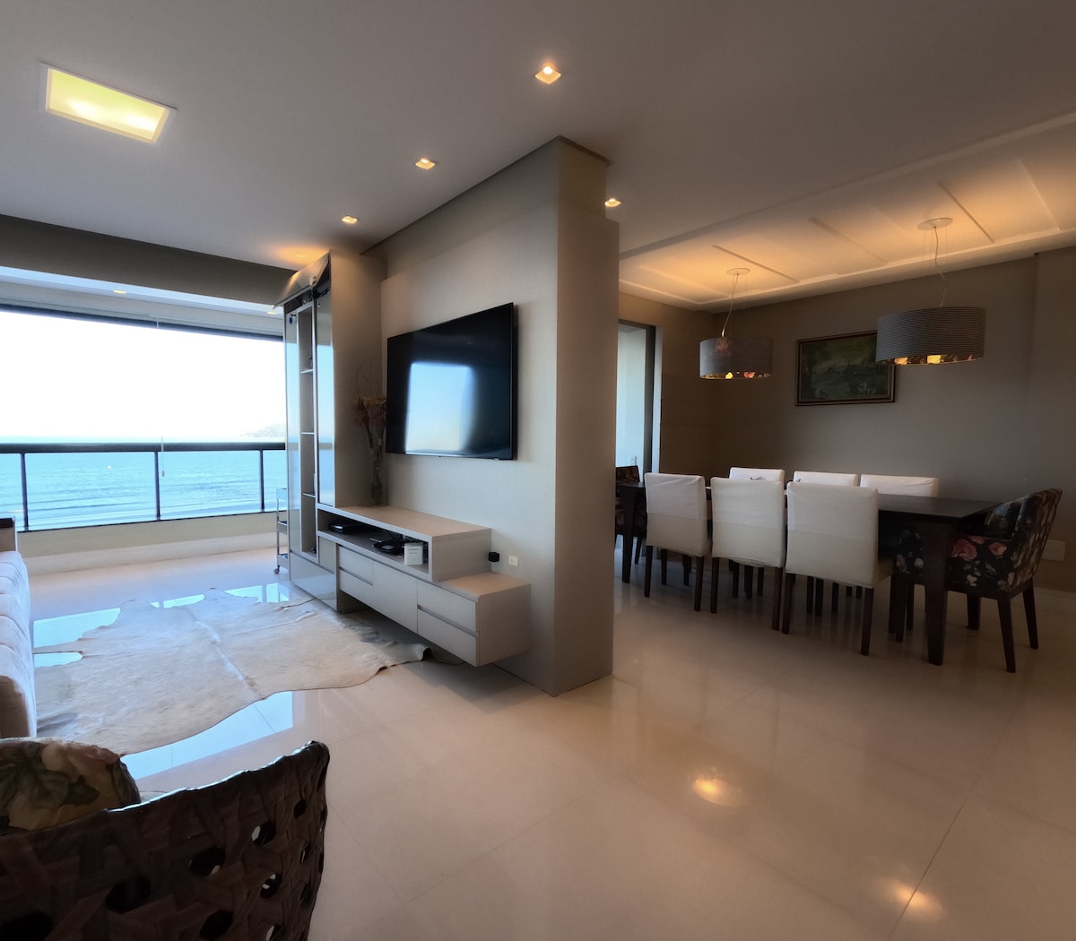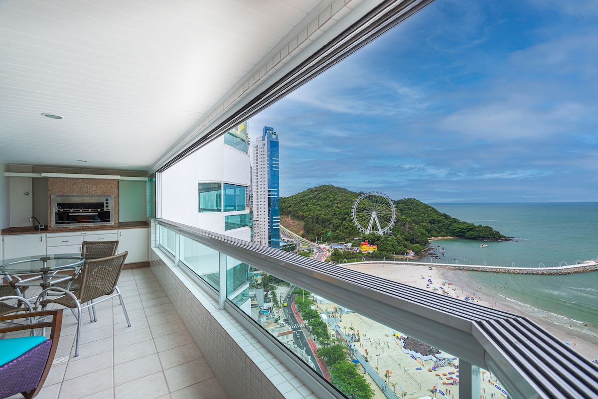 FRENTE MAR. São 4 quartos (Suite Casal, quarto Casal, quarto Casal com Beliche e Suite Solteiro). Tem uma varanda espetacular, ela tem poltronas e churrasqueira onde poderá ver o mar de uma vista de toda a praia de Itapema e Meia-Praia. O apto é perto de supermercados, Havan, restaurantes, bares, transporte público e do centro da cidade. Você vai amar nosso espaço porque fica na área mais tranquila da praia. Nosso apto é excelente para casais e famílias (com crianças).