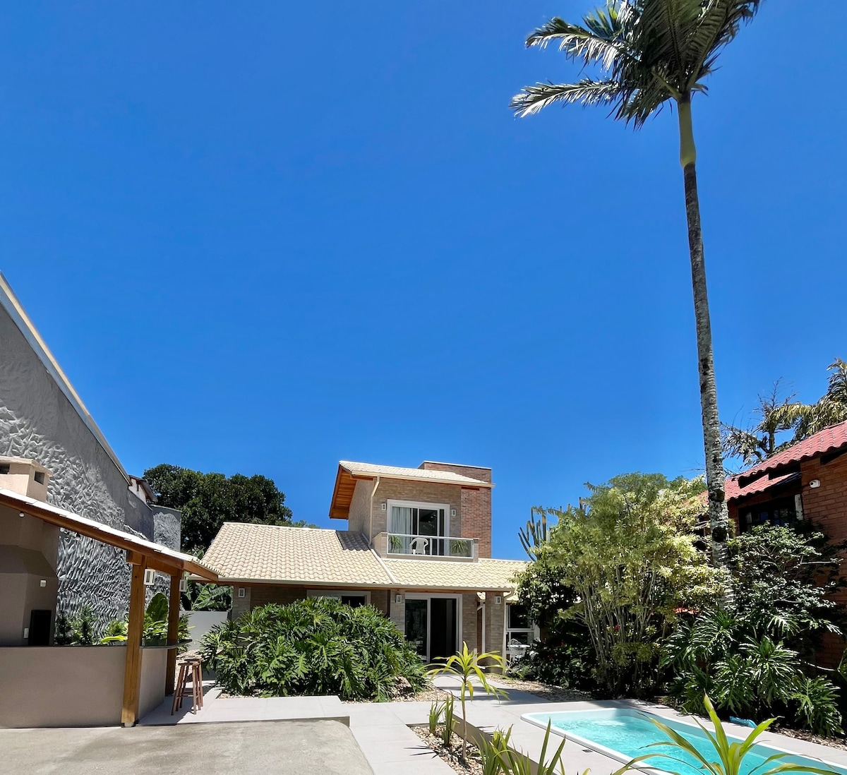 Abrace a simplicidade deste lugar tranquilo e bem localizado. Venha curtir suas férias com sua família e amigos em uma casa que mesmo localizada no centro e com apenas 450m da praia, você se sentirá pertinho da natureza, um lago com carpas e orquidário, espaço gourmet completo: com pia, churrasqueira e mesa, não podendo faltar a piscina. Importante: permitido animais somente de pequeno e médio porte DISPONIBILIZAMOS 4 CADEIRAS DE PRAIA.
