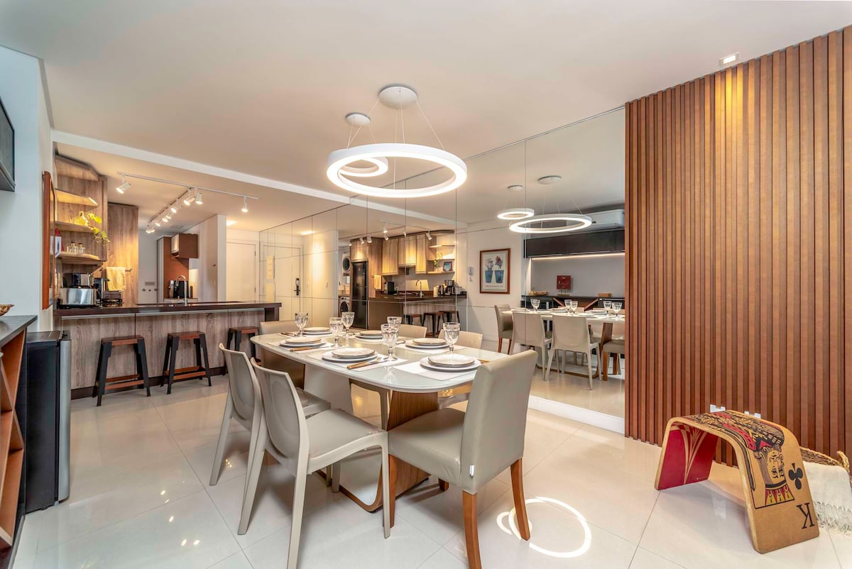 Leia nossas + de 100 avaliações, todas 5 estrelas! Apto completo para até 6 hóspedes: - 1 suíte+2 quartos (todos c/ ar condicionado e TV, os dois maiores com vista para o mar) - Sala de estar e jantar c/ vista direta para a barra norte - Cozinha e lavanderia totalmente equipadas - Garagem privativa para um veículo médio (*) - Edifício frente ao mar na av. Atlântica com vista total da orla na área comum e portaria 24h - Roupas de cama e banho limpos em lavanderia - Pet friendly