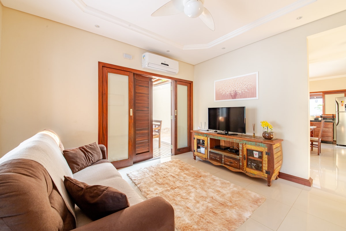 The house is a mezzanine and is located on the famous street of the river, a pleasant 5 minute walk to the Historical Cente. Situated in a quiet village of chalets in the early Cabore district, between two hotels: Pousada da Condessa and Provence, the street has a bike path and is close to restaurants, nightlife, 500m from the beach of Pontal and 1km from the beach Jabaquara. It has an open interior garden and also a covered part. Overlooking the green, a shower on the terrace and parking inside